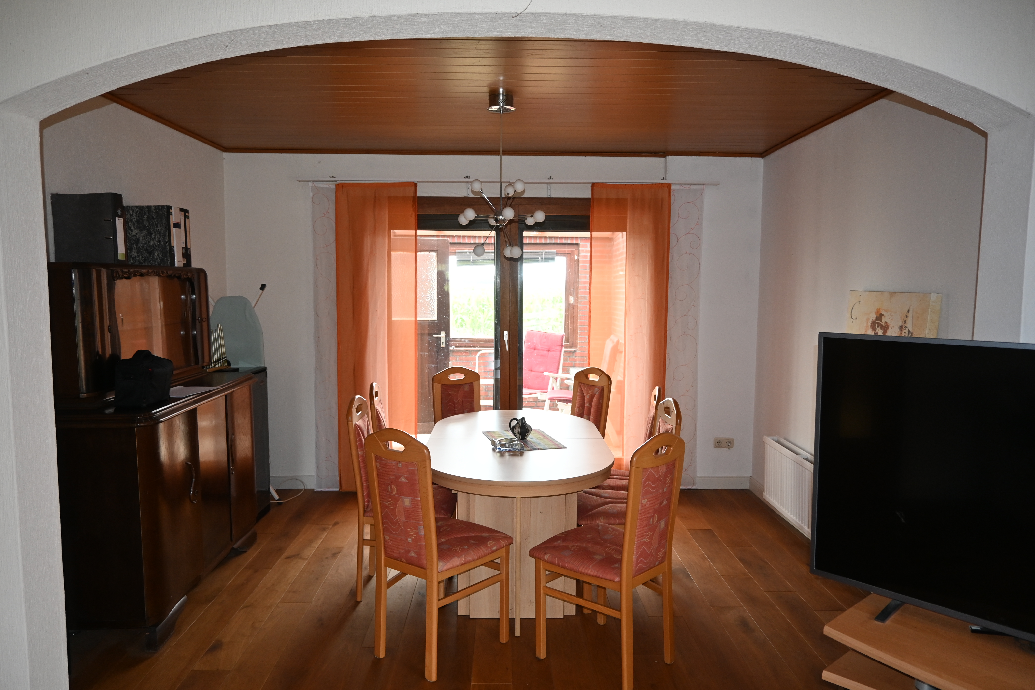 Vom geräumigen Wohnzimmer mit Essbereich gelangt man direkt in den Wintergarten.