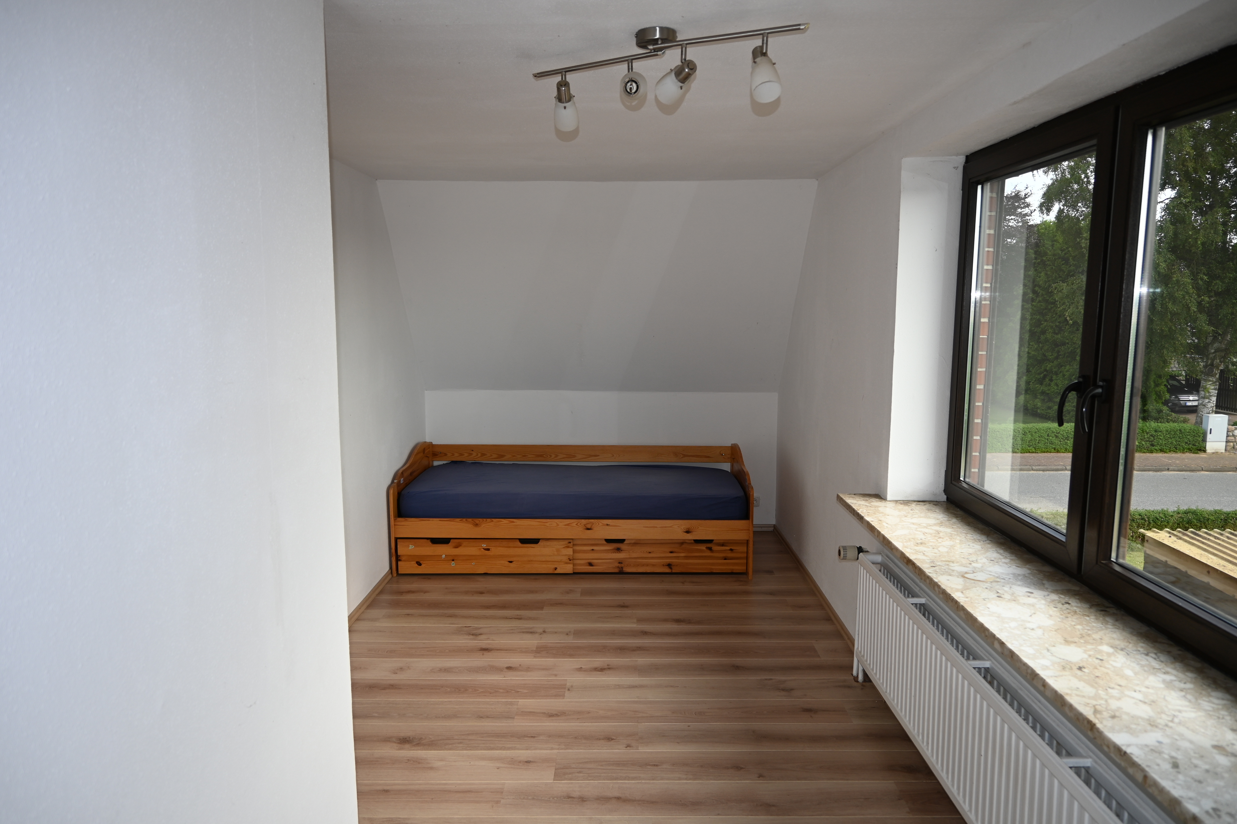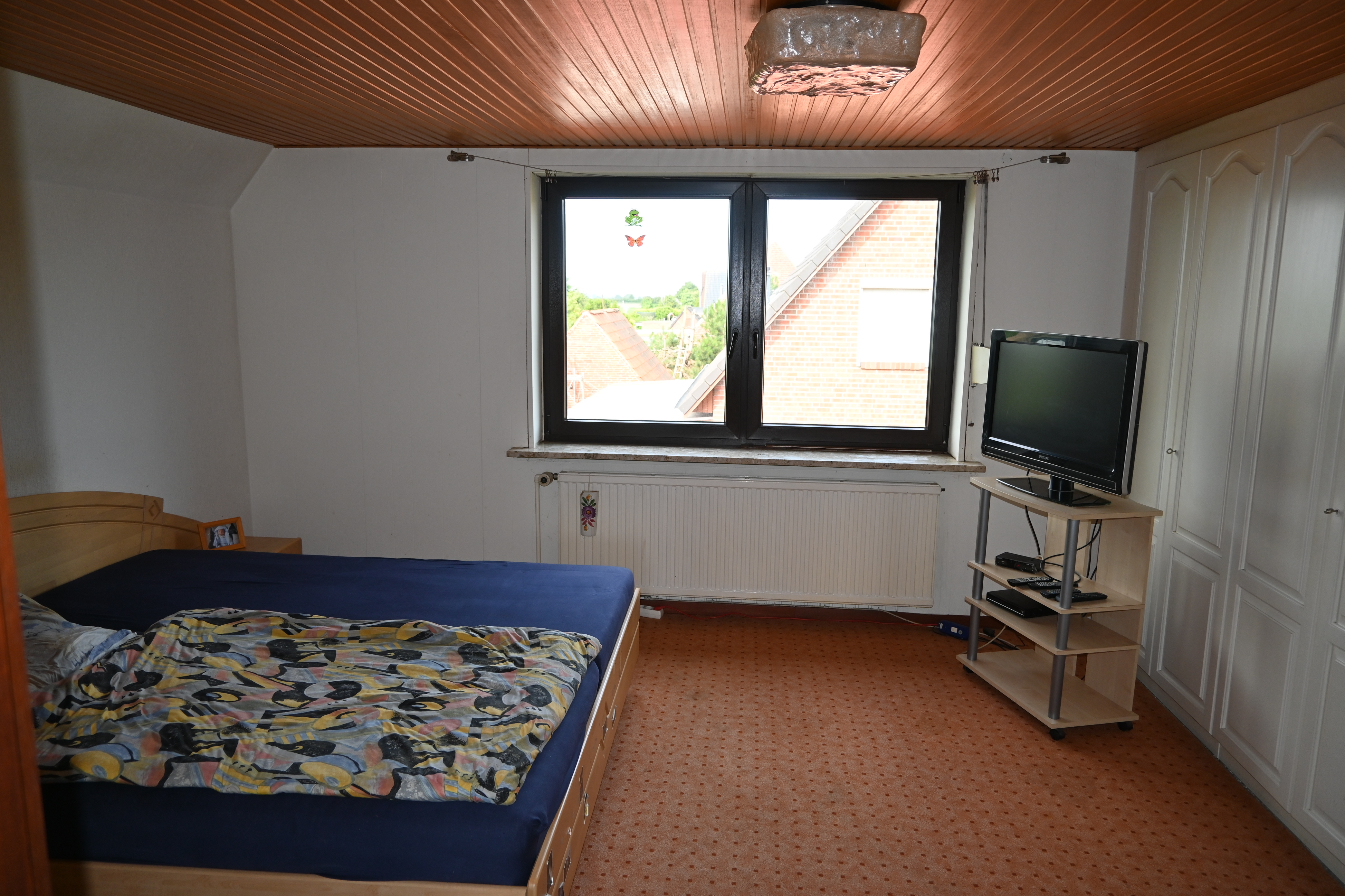 Im Dachgeschoss befindet sich ein geräumiges Schlafzimmer. Die feste Einbauschrankwand bietet reichlich Platz für Wäsche. Des Weiteren befinden sich ein großzügiges Kinderzimmer sowie ein kleines Kinderzimmer im Dachgeschoss. Außerdem finden Sie hier ein WC mit Dusche.