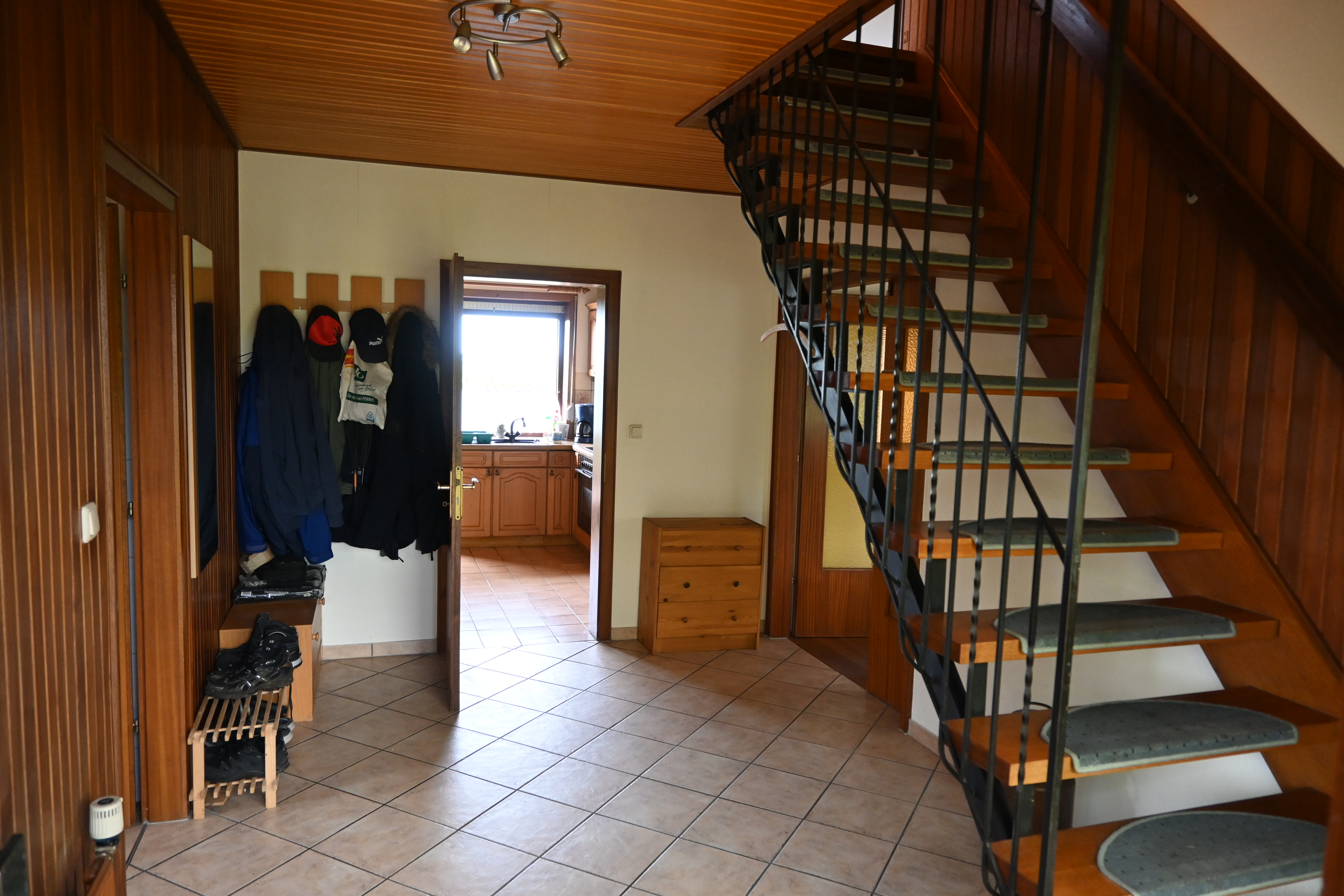 Im Eingangsbereich erwarten Sie reichlich Platzmöglichkeiten. Vom Flur aus gelangt man ins Badezimmer, Wohnzimmer mit Essbereich und in die Küche. Die Küche bietet Platz fürs gemütliche Zusammensein. Aus der Küche heraus gelangt man direkt auf die Terrasse und in den Garten. Angrenzend an der Küche befindet sich der Abstellraum, welcher direkt von der Küche aus zugänglich ist.