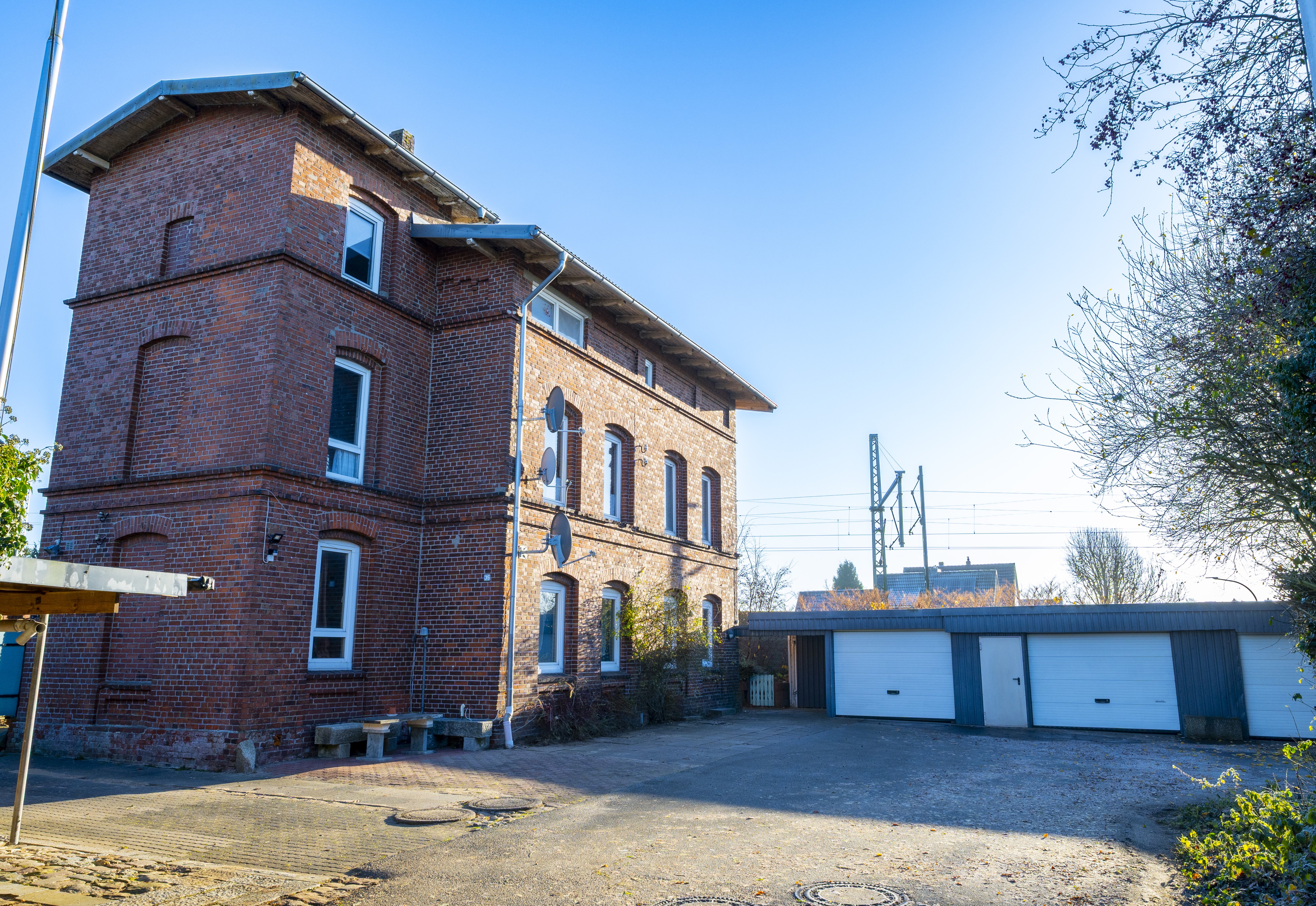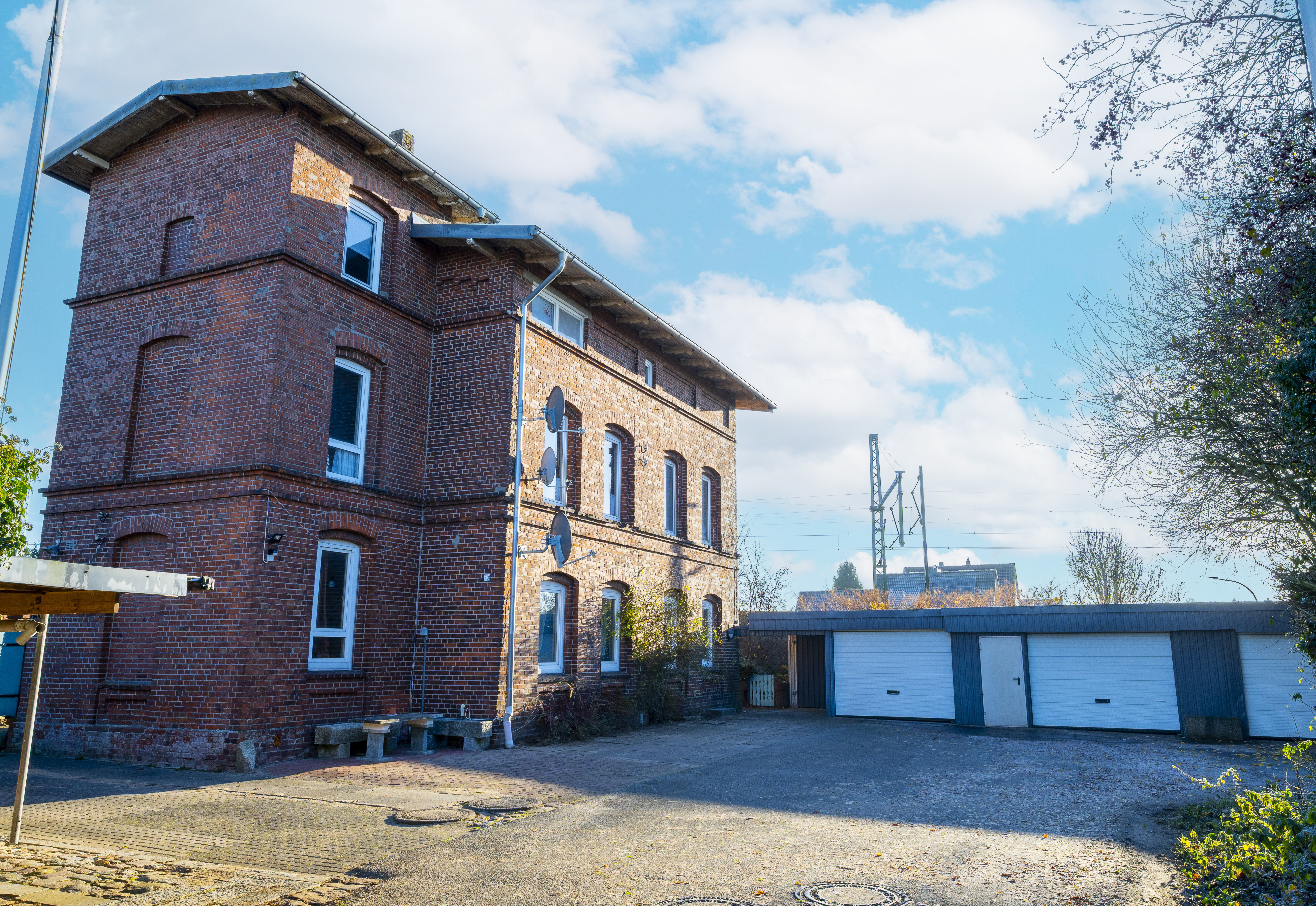 Zum Verkauf steht ein Mehrfamilienhaus mit insgesamt 3 Wohneinheiten. Das Mehrfamilienhaus wurde ca. 1898 in massiver Bauweise errichtet und gehörte bis 1984 der Deutschen Bahn an. Die Wohneinheit im Erdgeschoss ist über einen eigenen Hauseingang zu erreichen. Die Wohneinheiten im 1. OG und im DG sind über einen weiteren Hauseingang zu erreichen. Jede Wohneinheit verfügt über eine eigene Gasheizung. Die Gasheizung für die Wohneinheit im Erdgeschoss befindet sich im Teilkeller. Die Heizungen der anderen beiden Wohneinheiten befinden sich innerhalb der einzelnen Wohneinheiten. Das Mehrfamilienhaus ist teilunterkellert und bietet jeder Wohneinheit eigene Abstellmöglichkeiten. Ein Nebengebäude bietet ebenfalls reichlich Abstellmöglichkeiten. Weiterhin stehen den Mietern insgesamt 3 Garagen zur Verfügung. Derzeit werden alle 3 Garagen von der Mietpartei im Erdgeschoss genutzt. Im Jahr 2006 wurde eine Hohlraumdämmung durchgeführt. Hier wurde Steinwollegranulat in die Luftschicht des zweischaligen Mauerwerks eingeblasen. Vor einigen Jahren wurde auch das Dach und die Dachrinnen erneuert.