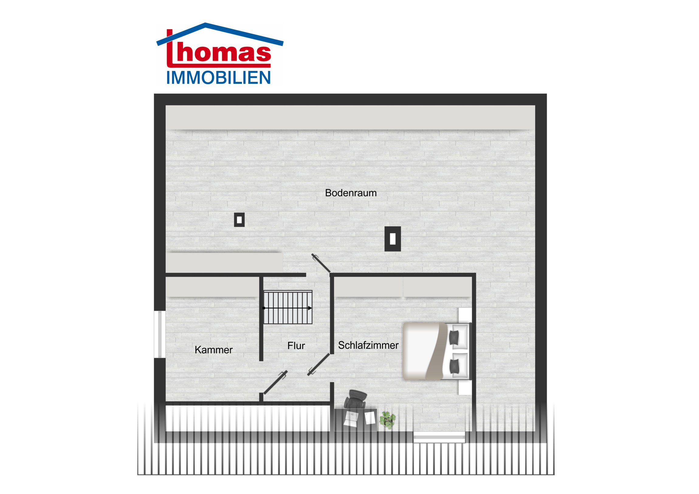 Hier befinden sich ein Schlafzimmer, eine Kammer und ein großer Bodenraum. Der Bodenraum bietet auch noch reichlich Ausbaureserve. Der angezeigte Grundriss zeigt nur eine Möglichkeit der Anordnung der Möbel bei ausgebauten Bodenraum.