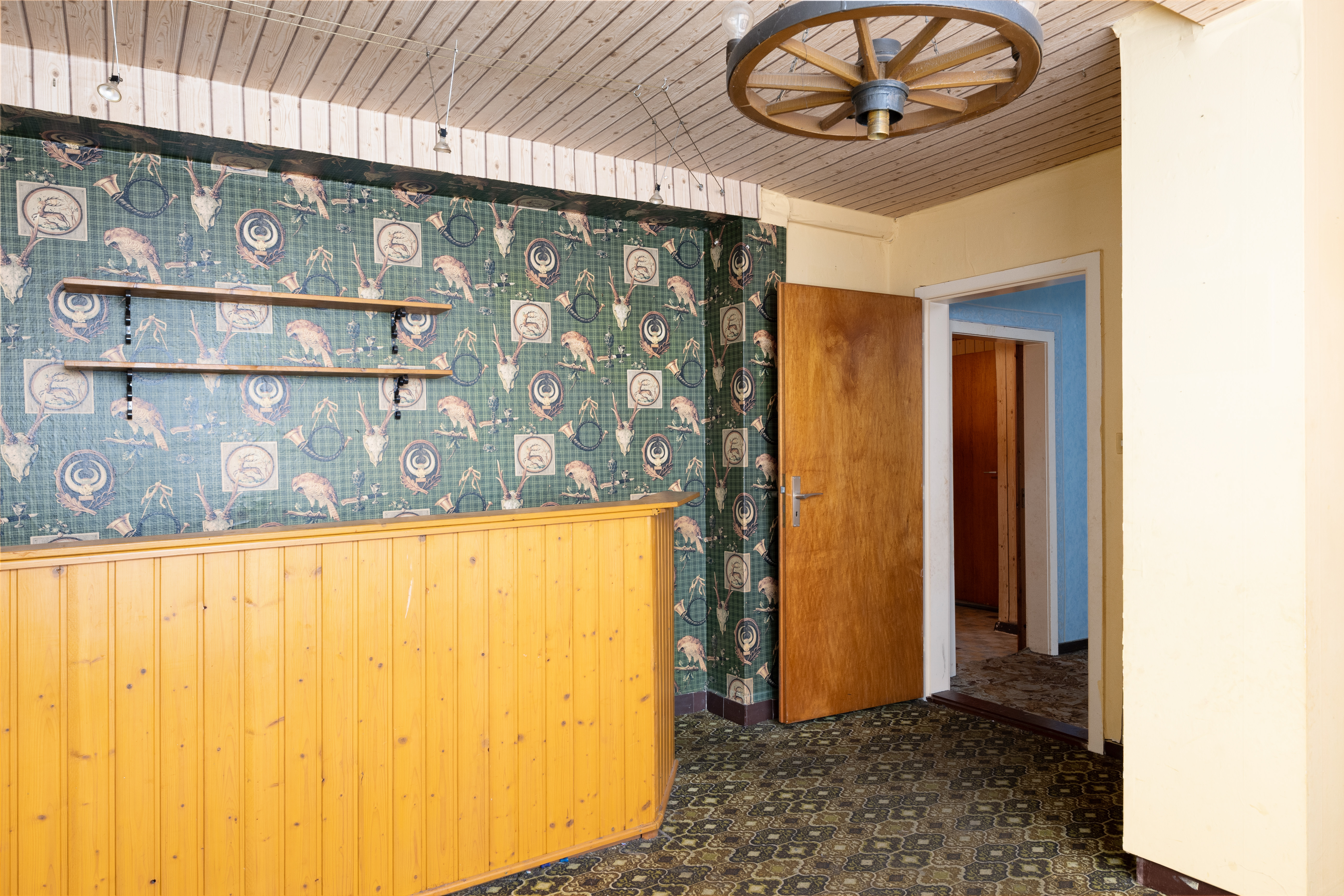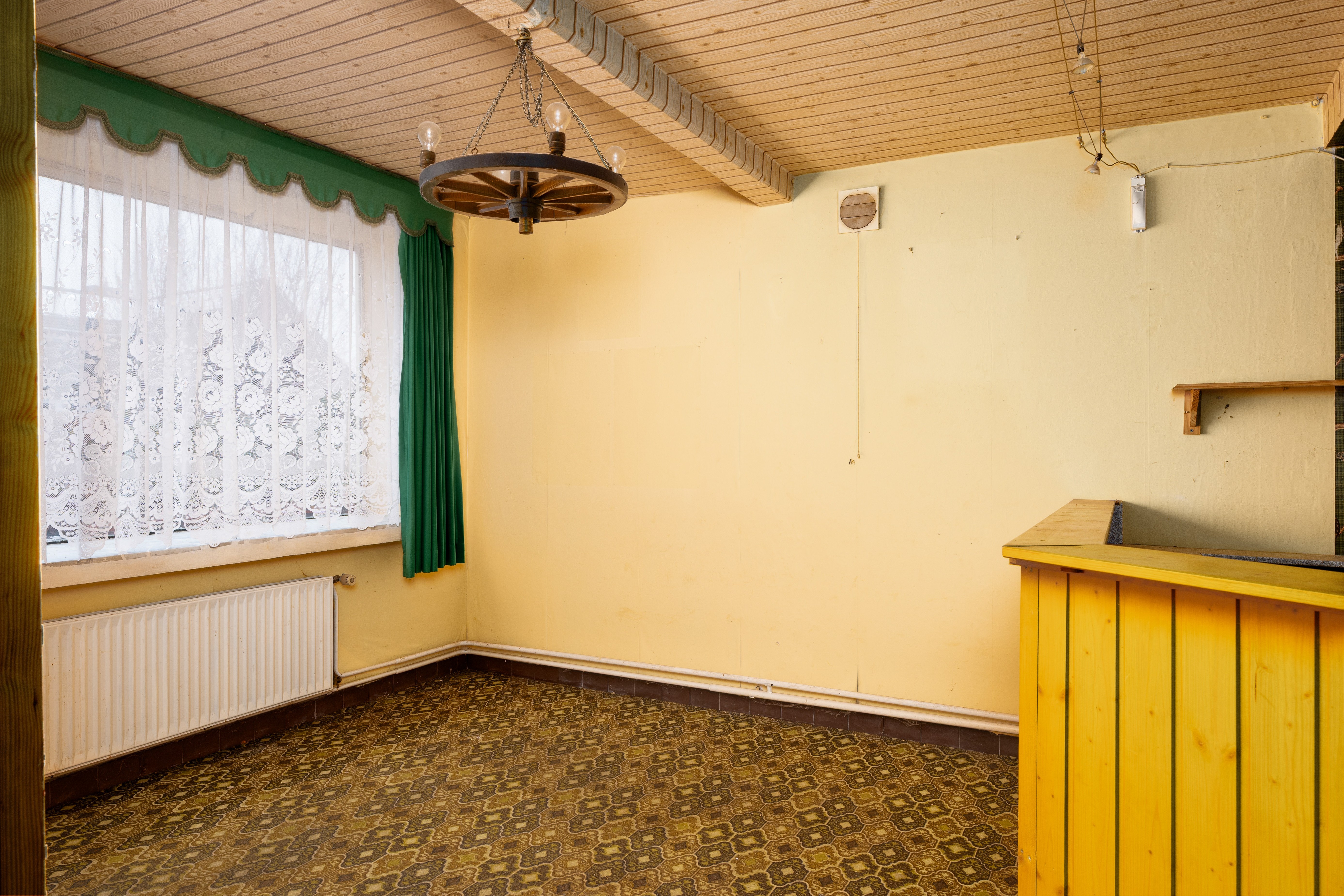 Im Erdgeschoss befindet sich die Küche. Von der Küche aus grenzt eine Speisekammer an, wo reichlich Platz für Vorräte vorhanden ist. Ein Bad mit Badewanne befindet sich ebenfalls im Erdgeschoss. Eine Kammer ist vom Bad aus zu erreichen. Neben der Kammer befindet sich ein großer Abstellraum. Dieser wurde bisher als Hauswirtschaftsraum genutzt. Ein geräumiger Wohn-Essbereich bietet reichlich Platz für die ganze Familie. Auf der gegenüberliegenden Seite befindet sich der ehemalige Ladenraum.