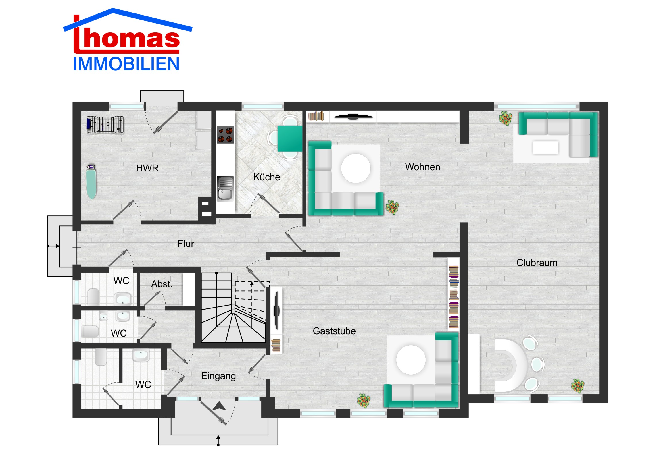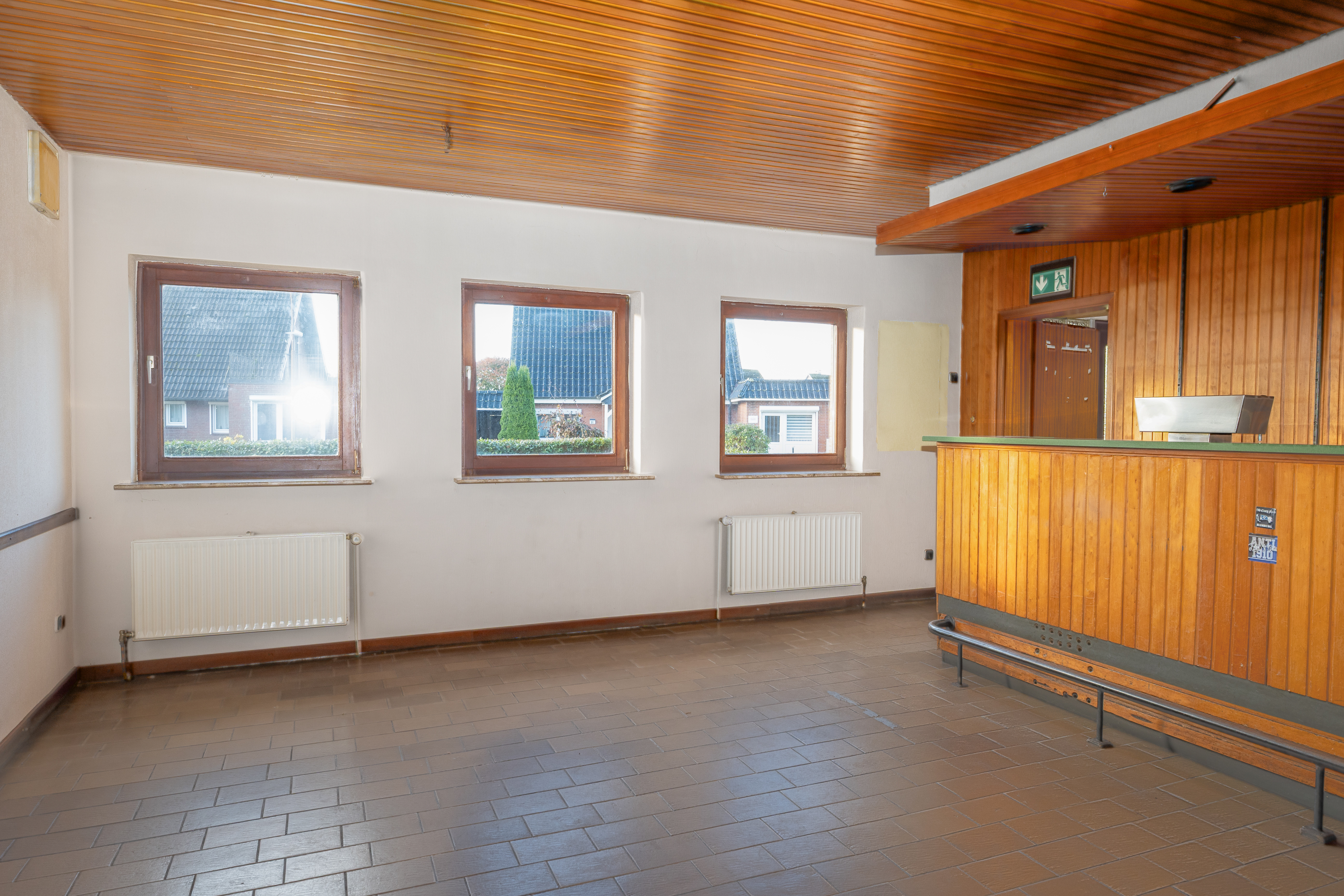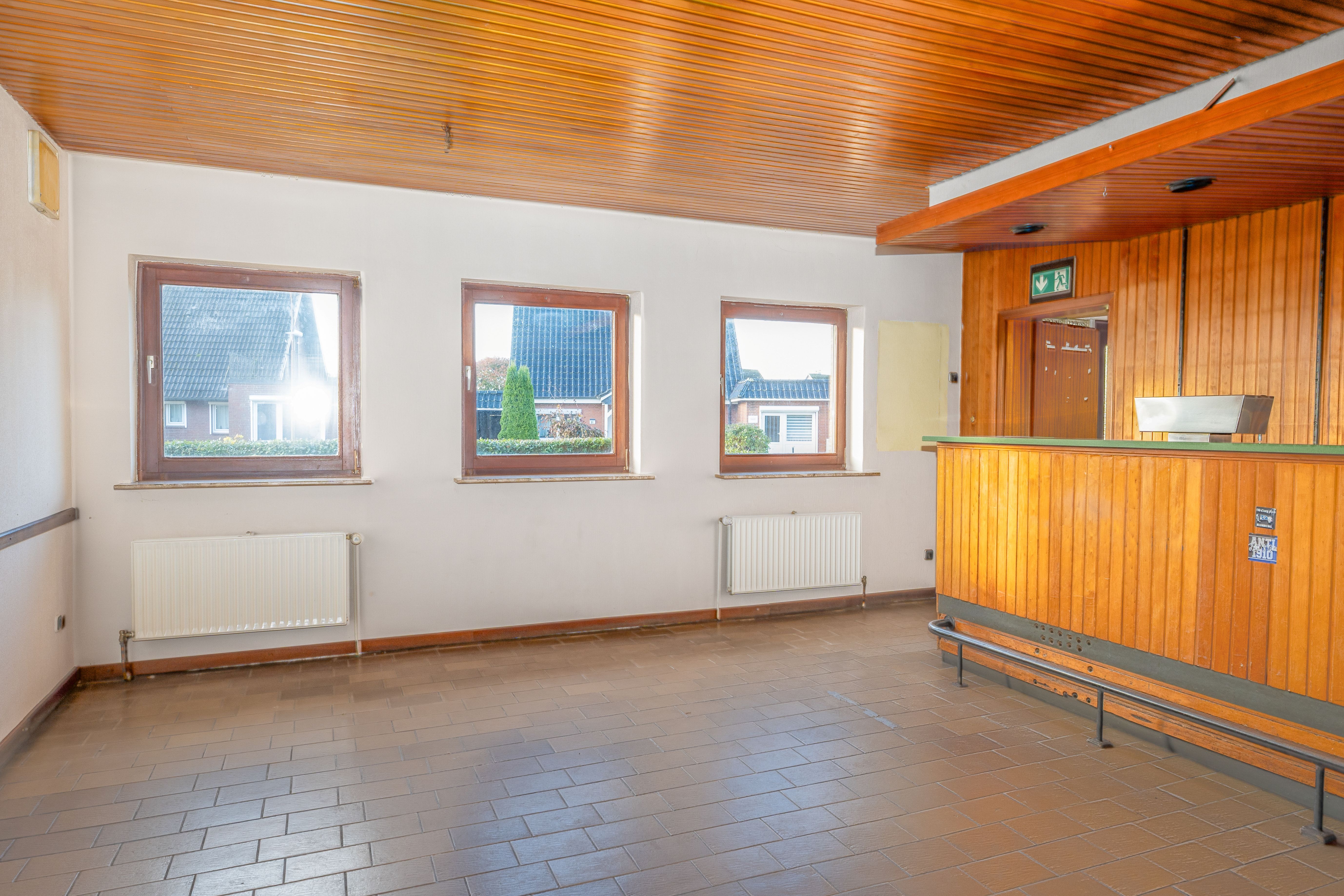 Von dem Hauseingang zum ehemaligen Gewerbe gelangt man in den Gastraum, Clubraum und zu den Herren- und Damen-WC's. Das ehemalige Wohnzimmer befindet sich ebenfalls im Erdgeschoss. Von dort gelangt man über den Flur zur Küche, zum Heizungsraum und zum Gäste-WC. Vom Heizungsraum gelangt man über die Terrasse in den Garten.