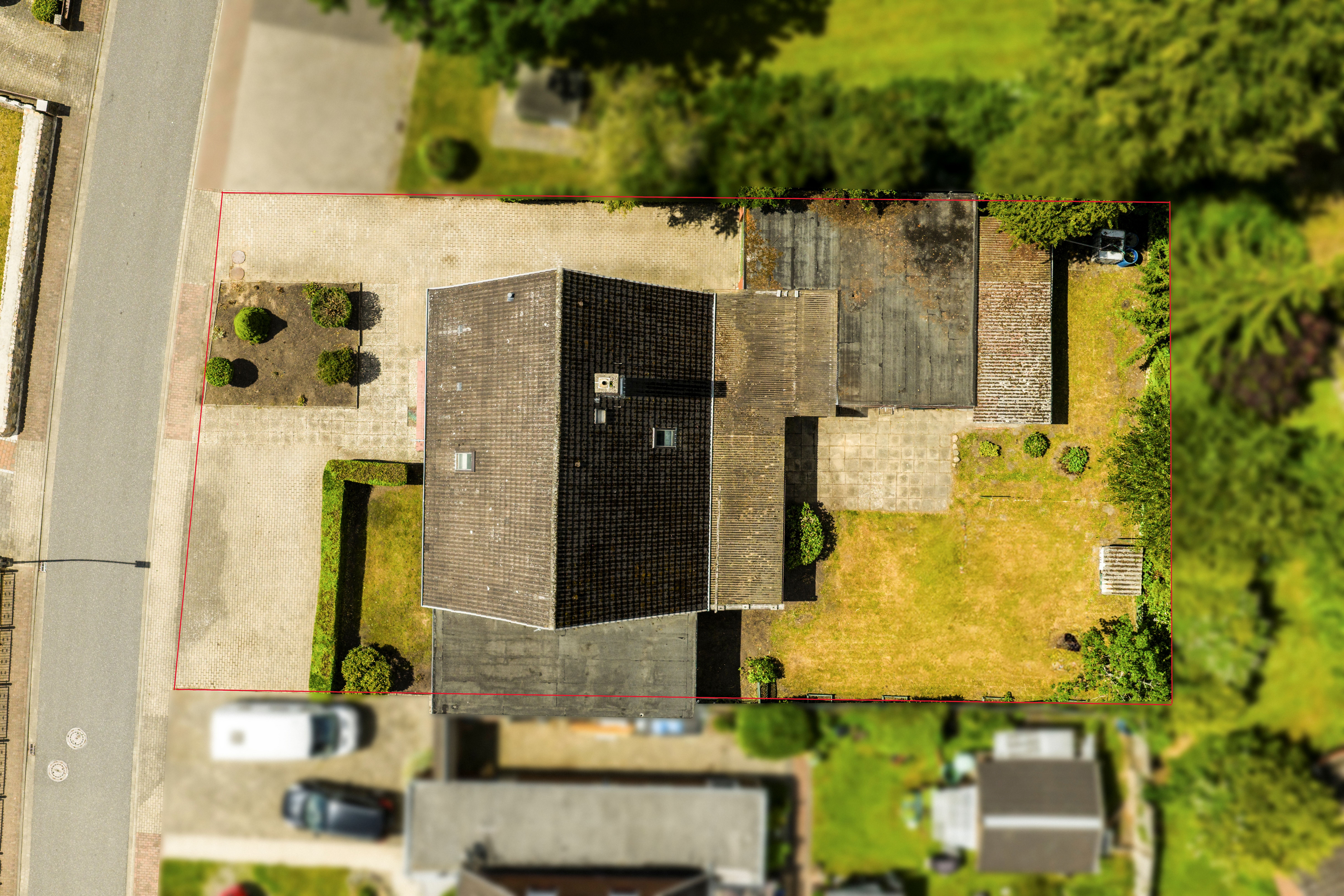 Eine Garage und ein Schuppen bieten reichlich Platz für Abstellmöglichkeiten. Vor dem Haus befindet sich eine Gartenfläche und 4 PKW Stellplätze. Hinter dem Haus befindet sich eine Terrasse und eine Rasenfläche. Hier können Gartenliebhaber sich frei entfalten.