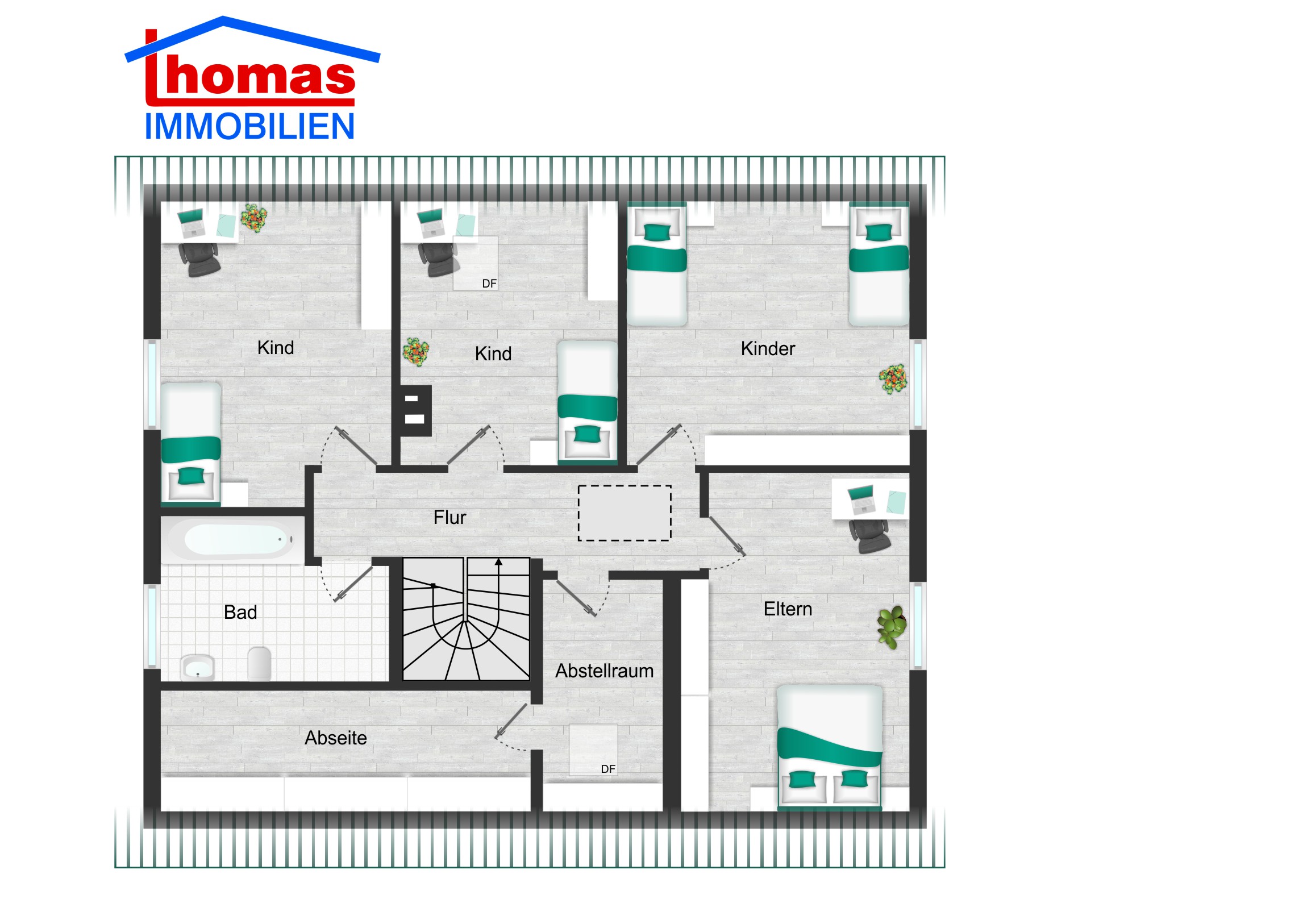 Im Dachgeschoss befinden sich 3 Kinderzimmer und 1 Schlafzimmer. Weiterhin befinden sich ein Badezimmer mit Dusche und Badewanne sowie ein Abstellraum im Dachgeschoss. Vom Dachgeschoss gelangt man über eine Treppe zum Spitzboden. Dort befinden sich 2 beheizte Hobbyräume.