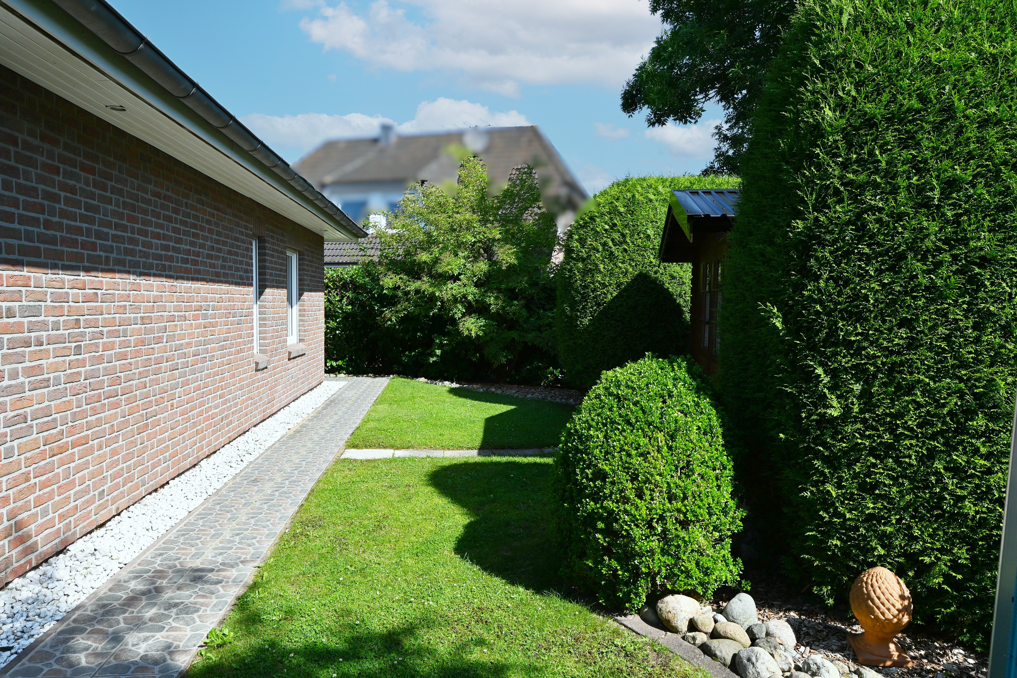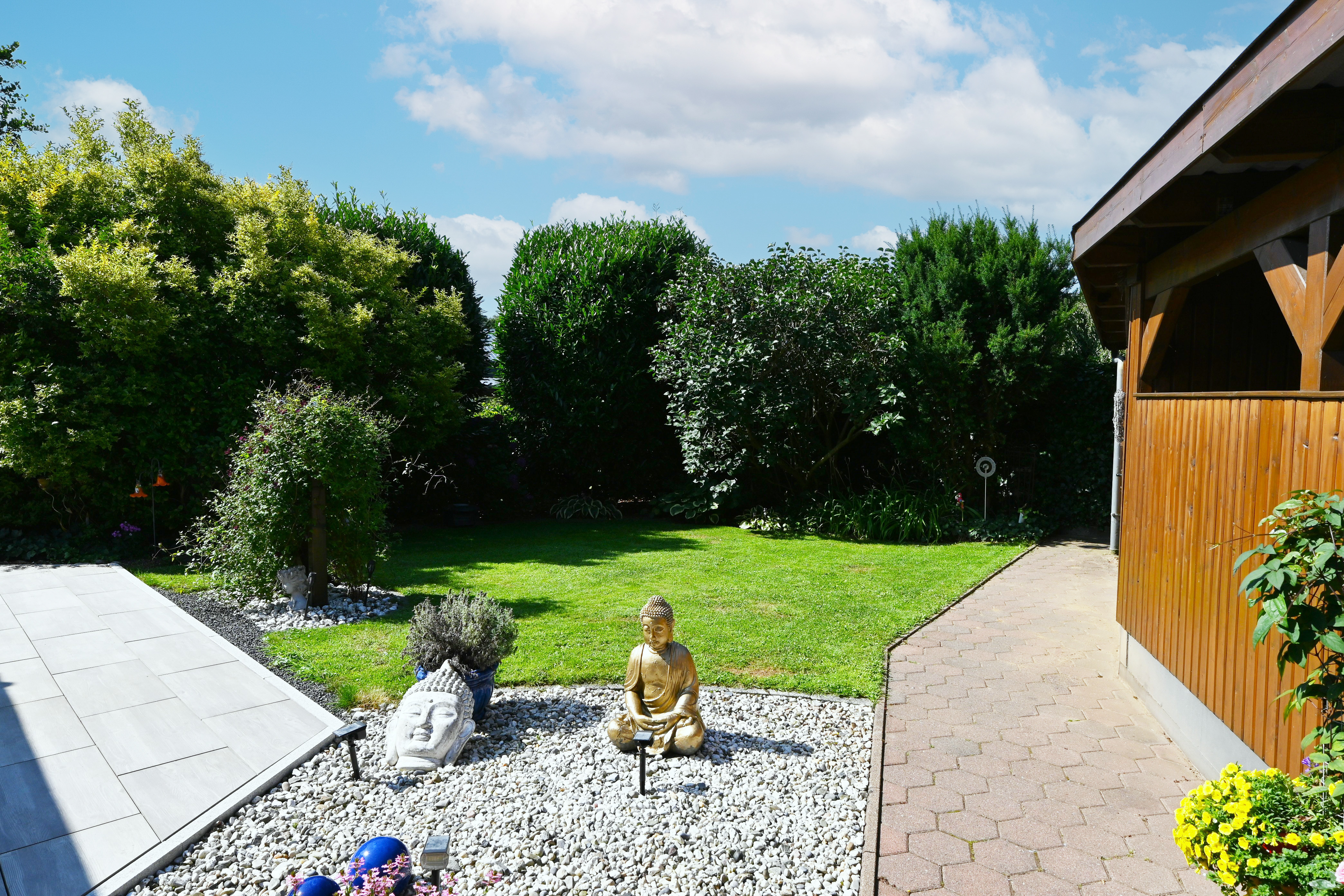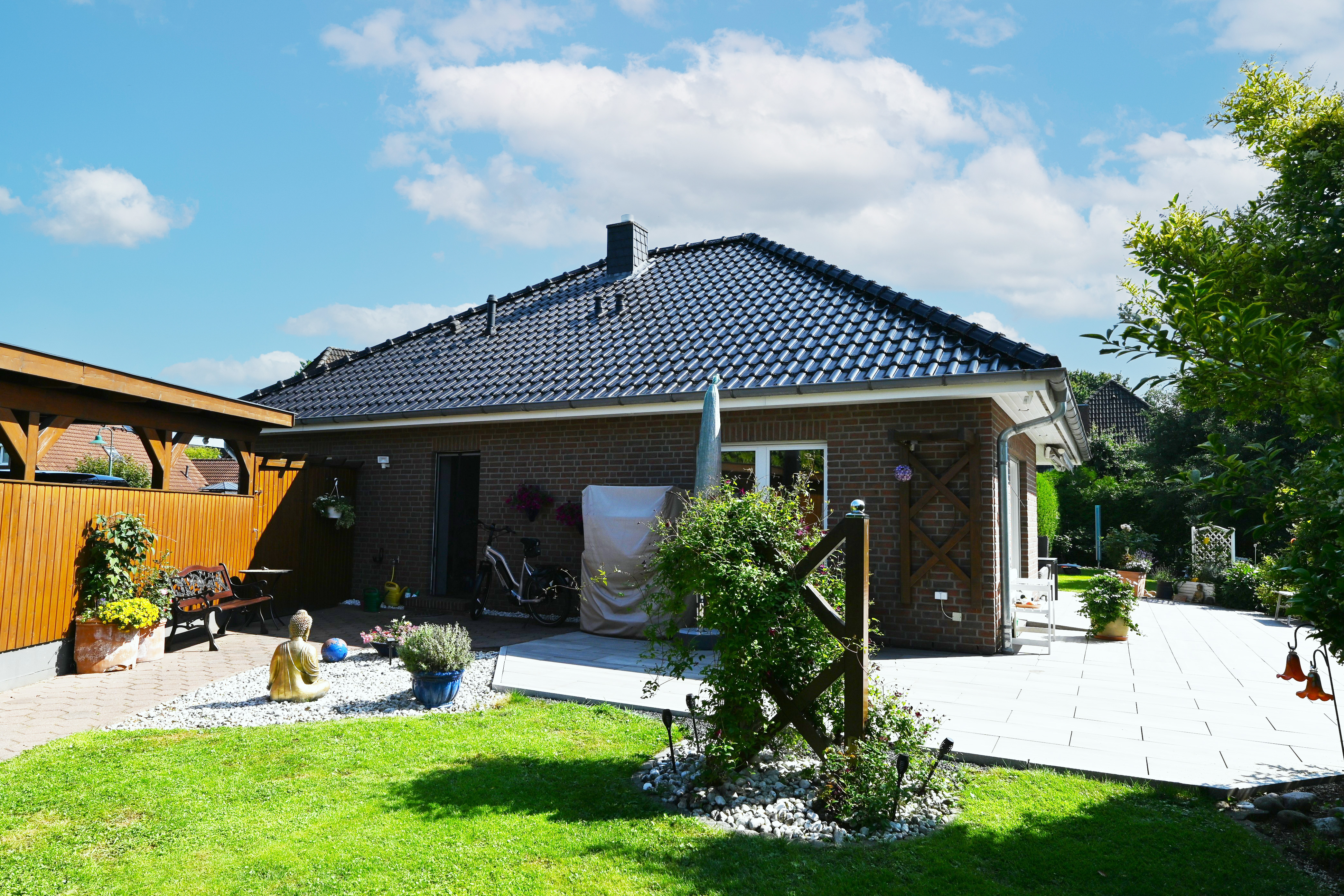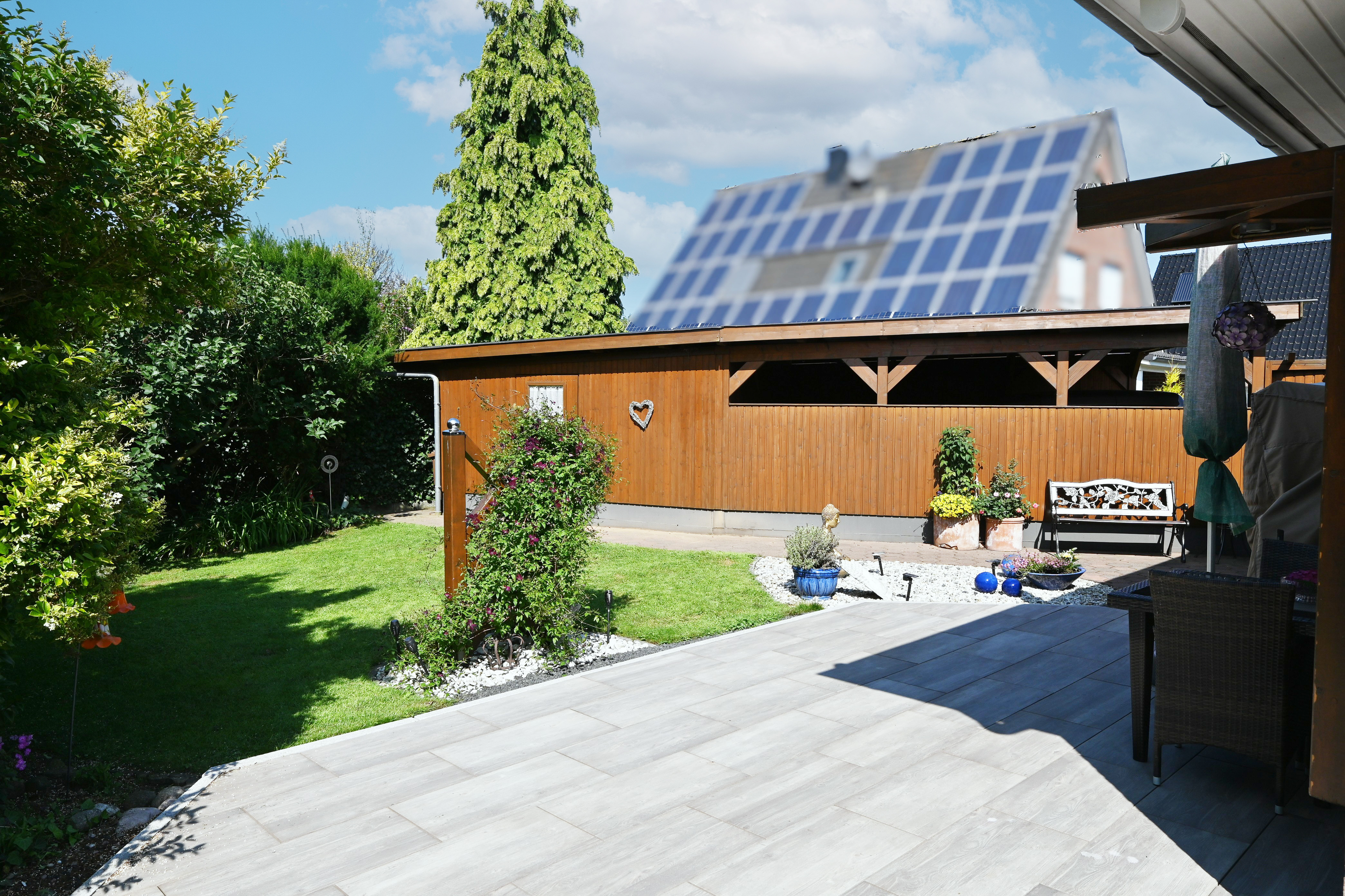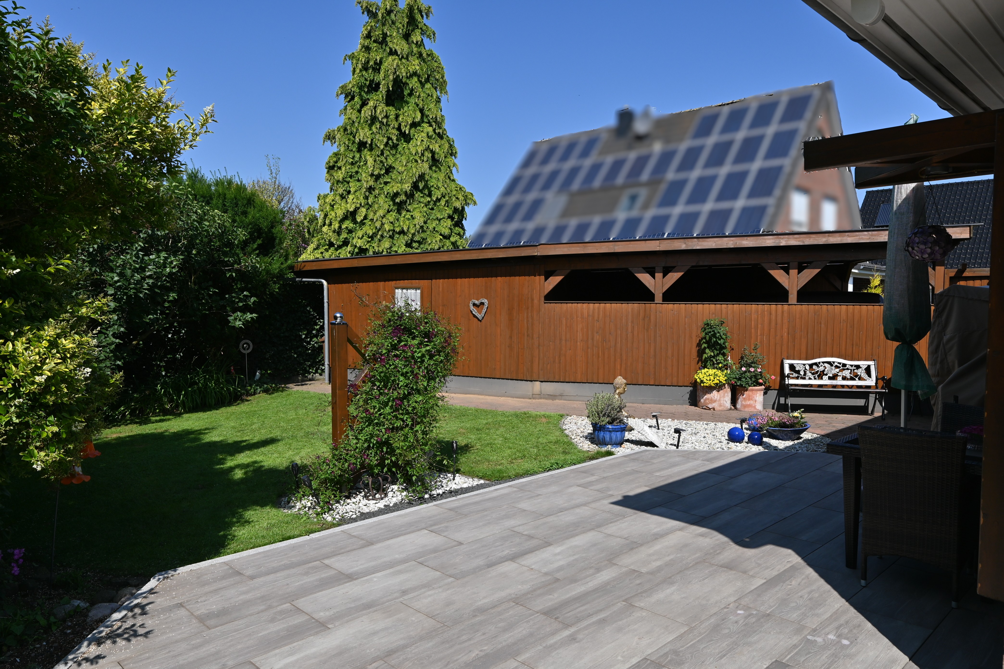 Rechts vom Haus befindet sich das große Doppelcarport mit Schuppen. Durch eine Tür rechts vom Haus gelangt man in den Garten und zur Terrasse der Westseite. Die große Südterrasse bietet reichlich Platz für schönes Beisammensein mit der ganzen Familie. Durch den angelegten Weg um das Haus gelangt man auch bei schlechtem Wetter trockenen Fußes um das Haus herum. Der gepflegte Garten ist liebevoll angelegt, bietet reichlich Platz für Gartenliebhaber/innen. Auf der Ostseite befindet sich ein kleines Gartenhäuschen, welches derzeit als Abstellfläche dient.