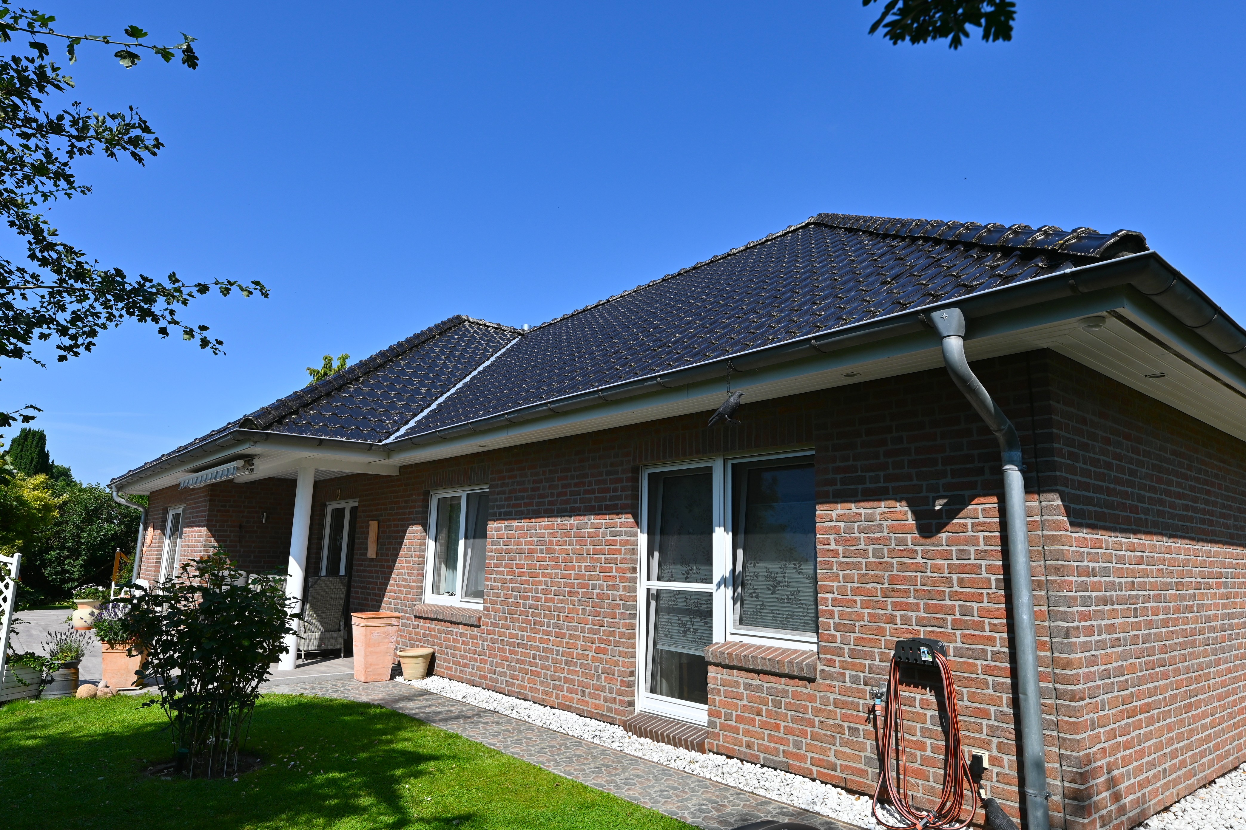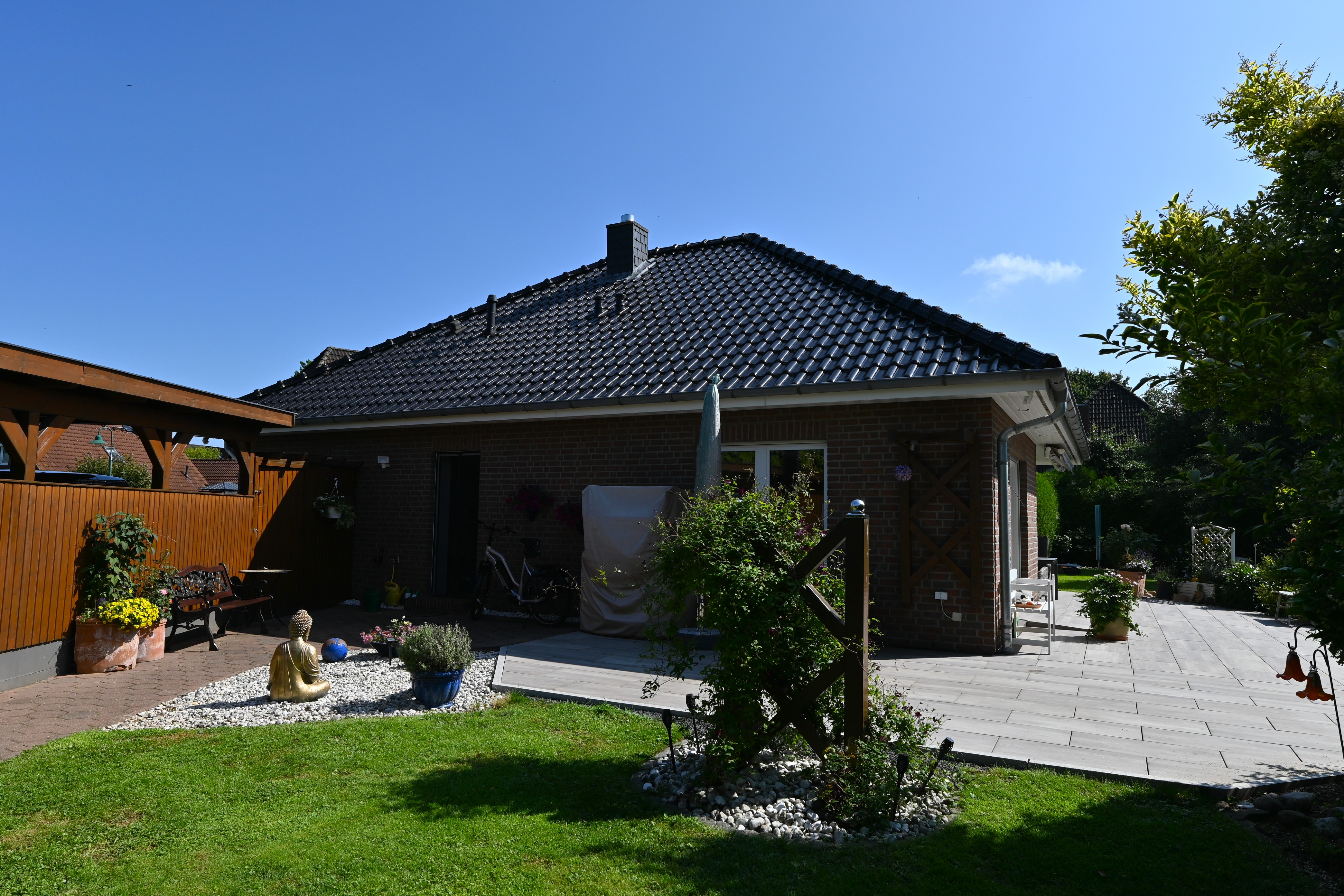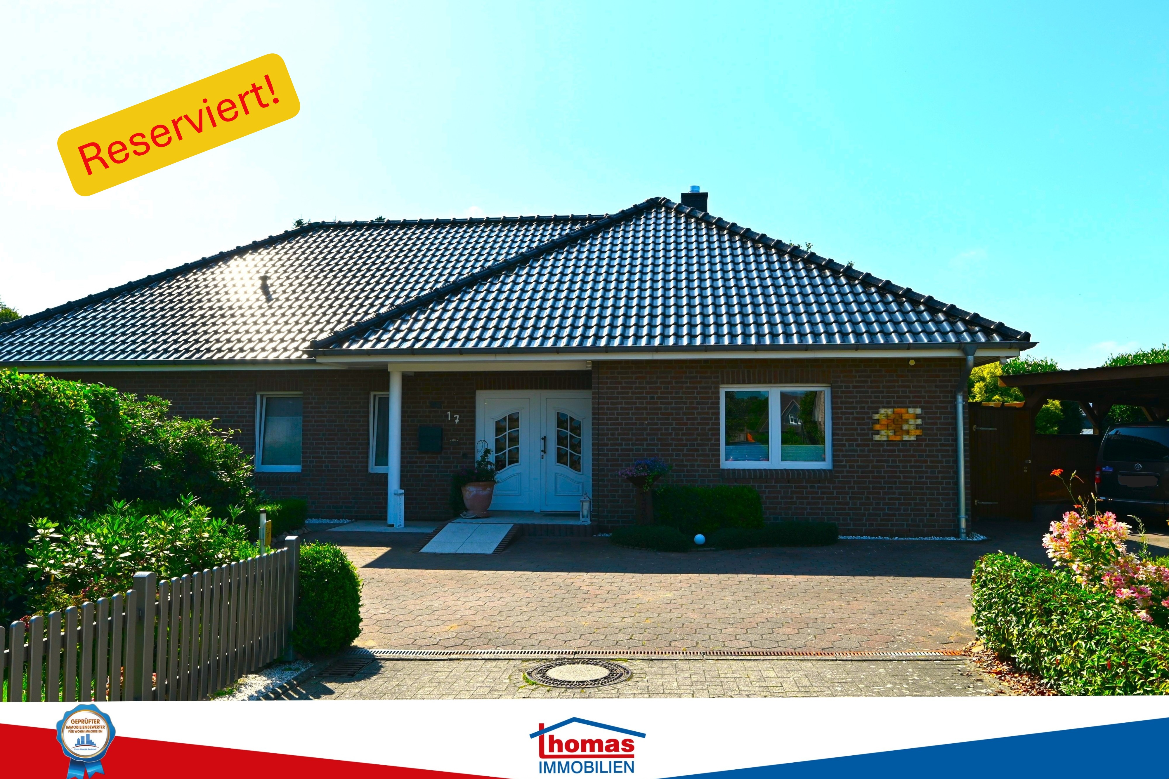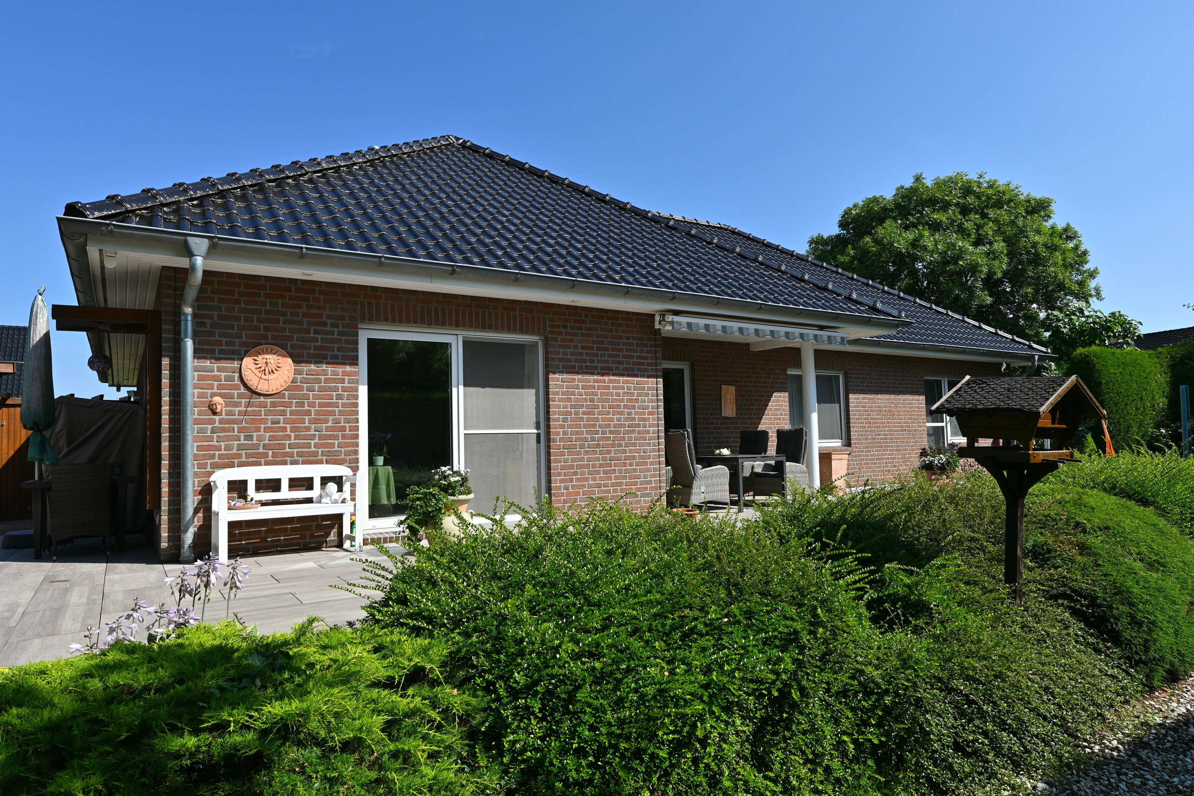 Der Bungalow wurde im Jahr 2000 in massiver Bauweise als Niedrigenergiehaus erbaut. Nach den heutigen gesetzlichen Bestimmungen zählt das Haus nicht mehr zu den Niedrigenergiehäusern. Das Haus befindet sich in einer ruhigen Sackgassenlage, sticht sofort durch die schöne Bauweise ins Auge wenn man in die Straße reinfährt. Die Wohn-/Nutzfläche von 146,56 m² bietet reichlich Platz für die Familie. Egal ob jung oder alt, hier spielt sich das Leben auf nur einer Etage ab. Das Haus ist rollstuhlgerecht und hat Fußbodenheizung in Bad, Gäste-WC, Diele/Flur, Wohnzimmer, Essbereich, Küche sowie Hauswirtschaftsraum. Zusätzlich gibt es dann noch Wandheizkörper in den einzelnen Räumen. Alle Fenster lassen sich über elektrische Außenrollos abdunkeln. Diese können pro Raum gesteuert oder aber über eine Zeitschaltuhr geregelt werden. Weiterhin lassen sich die Außenrollos des Hauses vom Schlafzimmer aus hoch und runter fahren. Ca. 100 m entfernt befindet sich ein kleiner Spielplatz. Das 902 m² große, liebevoll angelegte Grundstück bietet reichlich Platz und Raum für Gartenliebhaber/innen. Das große Doppelcarport bietet Platz für 2 PKW. Direkt hinter dem Carport befindet sich ein Schuppen. Im Jahr 2018 wurde eine neue Buderus-Heizung eingebaut.
