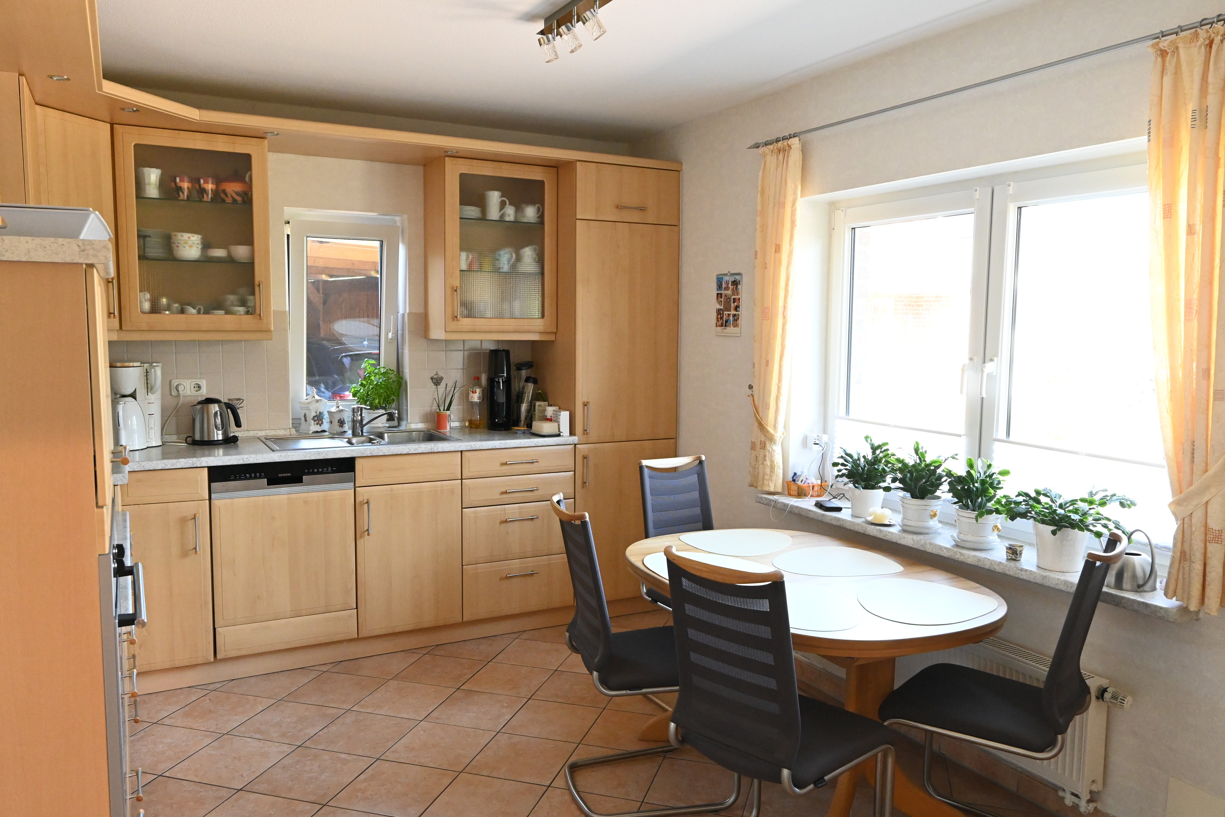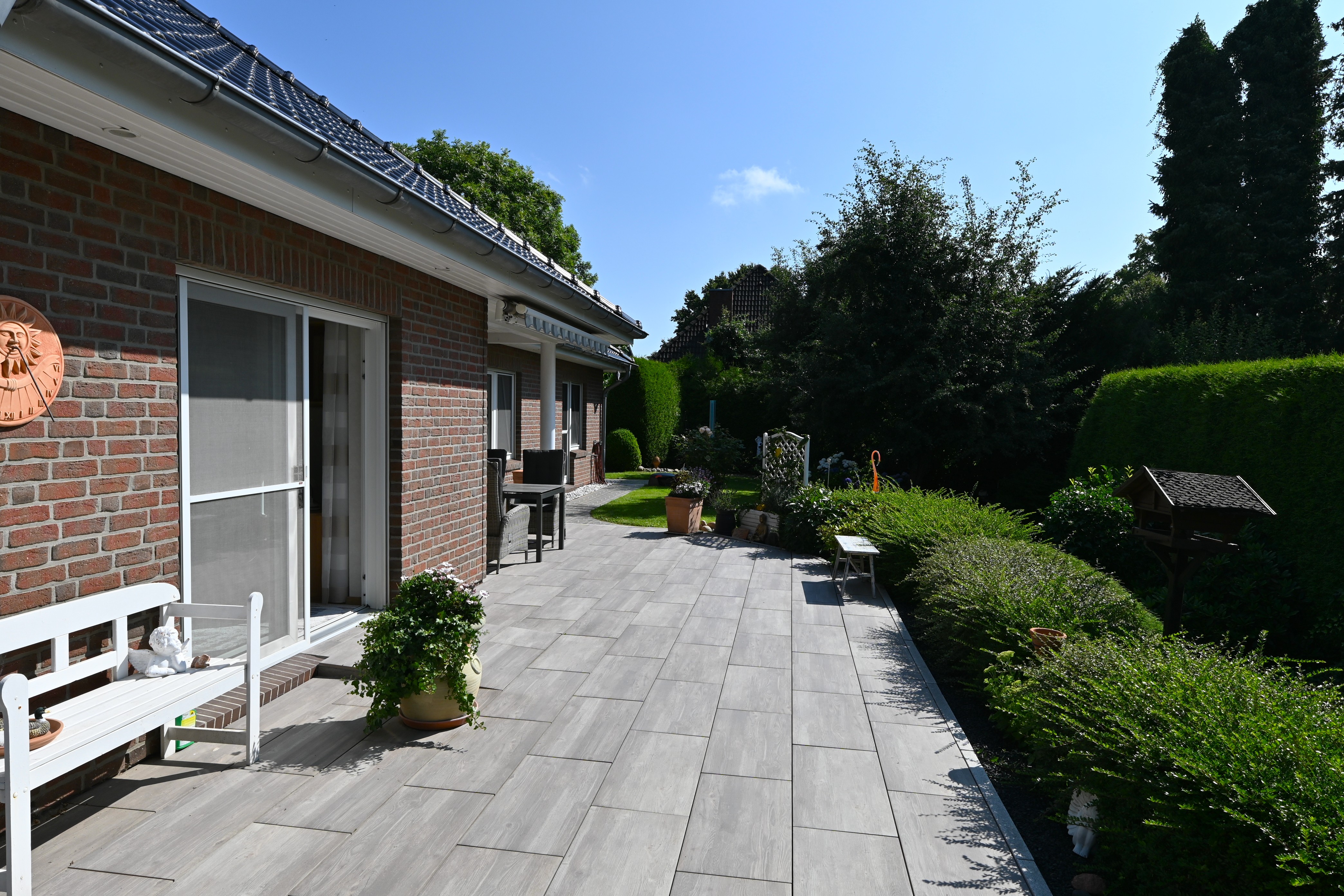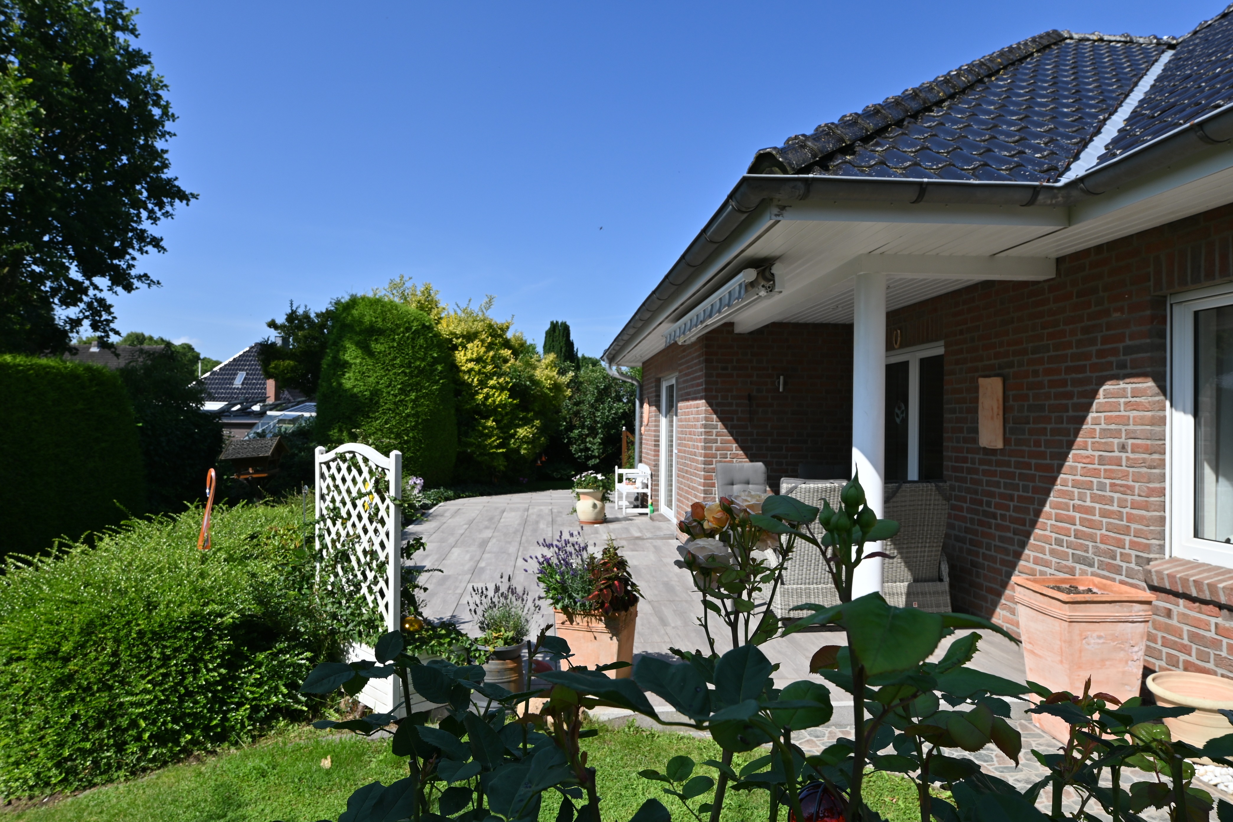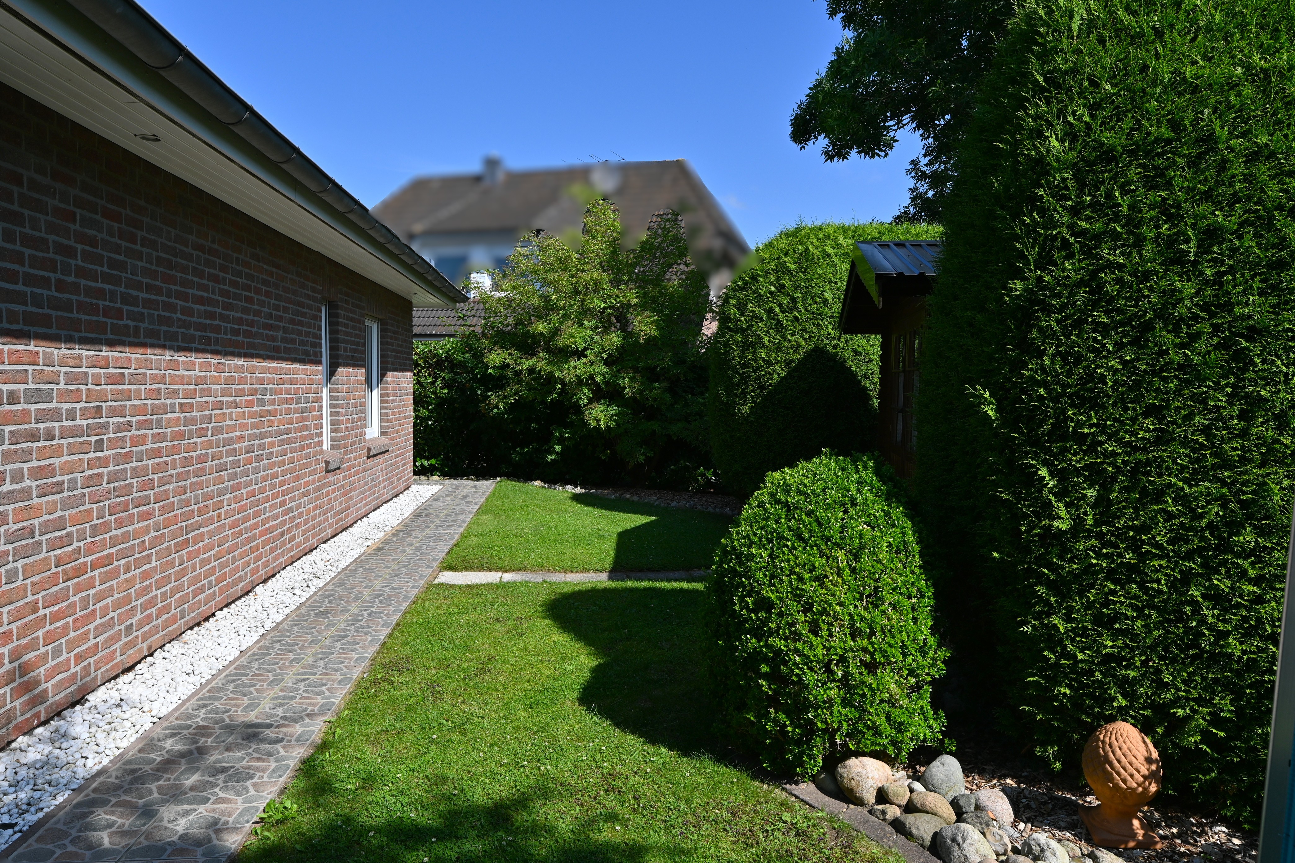 Der Bungalow wurde im Jahr 2000 in massiver Bauweise als Niedrigenergiehaus erbaut. Nach den heutigen gesetzlichen Bestimmungen zählt das Haus nicht mehr zu den Niedrigenergiehäusern. Das Haus befindet sich in einer ruhigen Sackgassenlage, sticht sofort durch die schöne Bauweise ins Auge wenn man in die Straße reinfährt. Die Wohn-/Nutzfläche von 146,56 m² bietet reichlich Platz für die Familie. Egal ob jung oder alt, hier spielt sich das Leben auf nur einer Etage ab. Das Haus ist rollstuhlgerecht und hat Fußbodenheizung in Bad, Gäste-WC, Diele/Flur, Wohnzimmer, Essbereich, Küche sowie Hauswirtschaftsraum. Zusätzlich gibt es dann noch Wandheizkörper in den einzelnen Räumen. Alle Fenster lassen sich über elektrische Außenrollos abdunkeln. Diese können pro Raum gesteuert oder aber über eine Zeitschaltuhr geregelt werden. Weiterhin lassen sich die Außenrollos des Hauses vom Schlafzimmer aus hoch und runter fahren. Ca. 100 m entfernt befindet sich ein kleiner Spielplatz. Das 902 m² große, liebevoll angelegte Grundstück bietet reichlich Platz und Raum für Gartenliebhaber/innen. Das große Doppelcarport bietet Platz für 2 PKW. Direkt hinter dem Carport befindet sich ein Schuppen. Im Jahr 2018 wurde eine neue Buderus-Heizung eingebaut.
