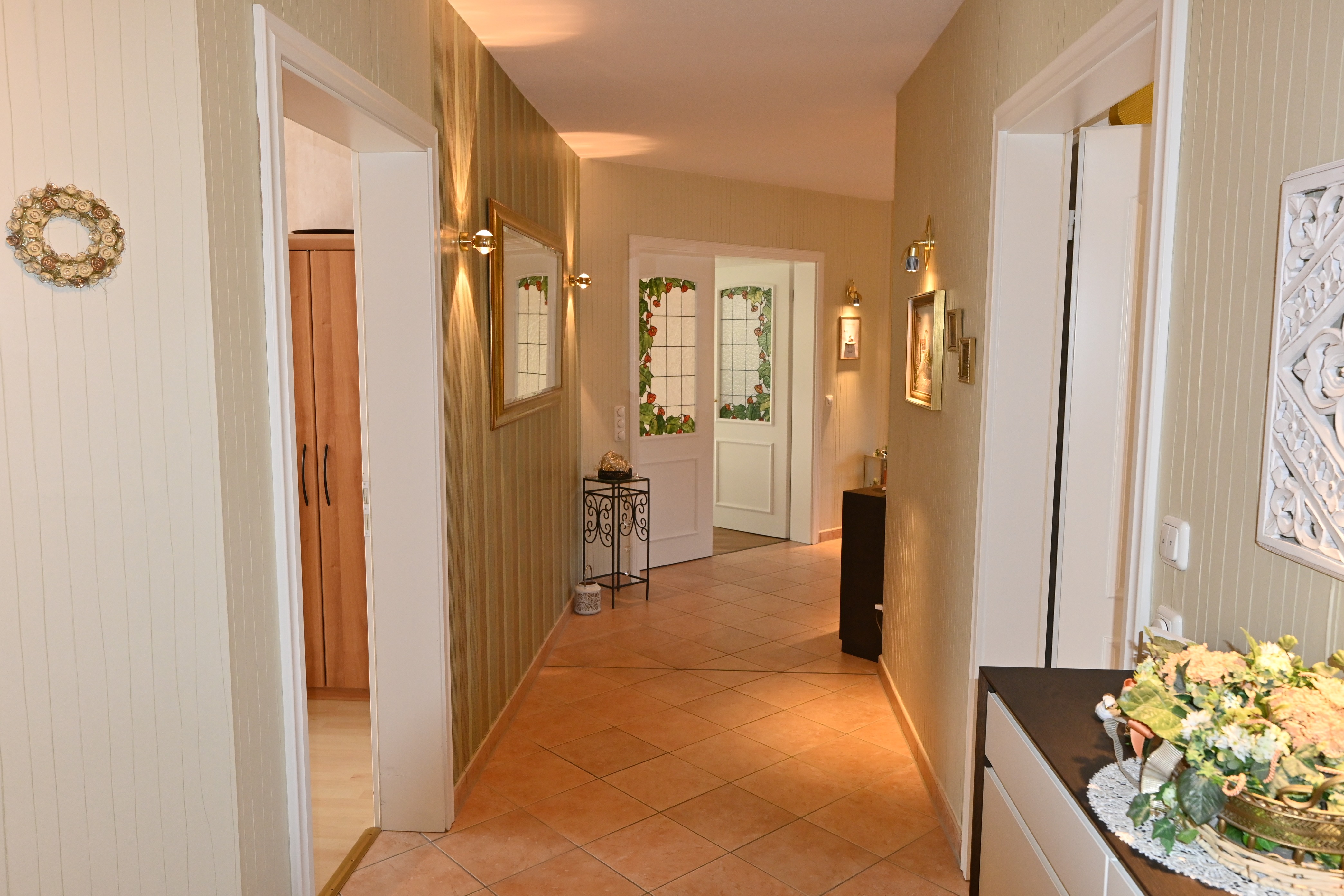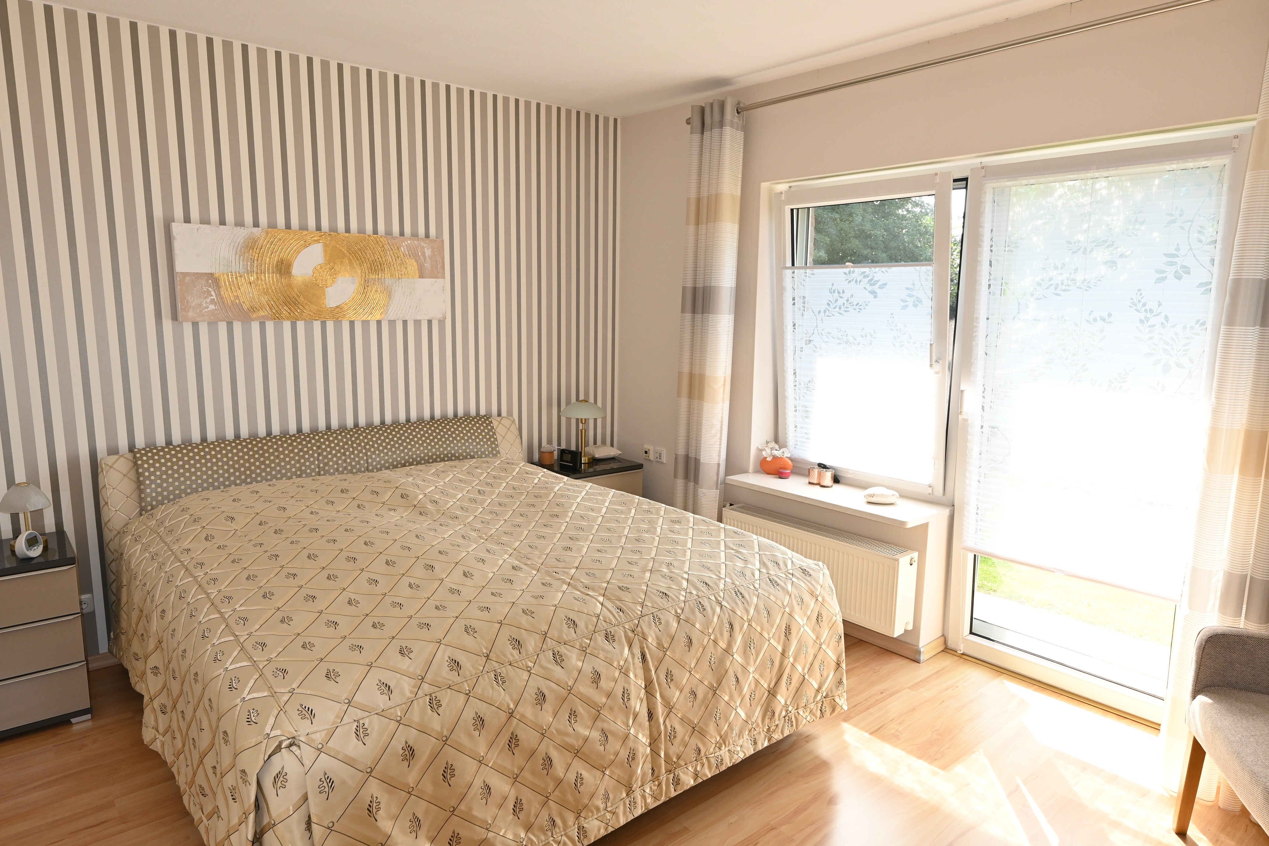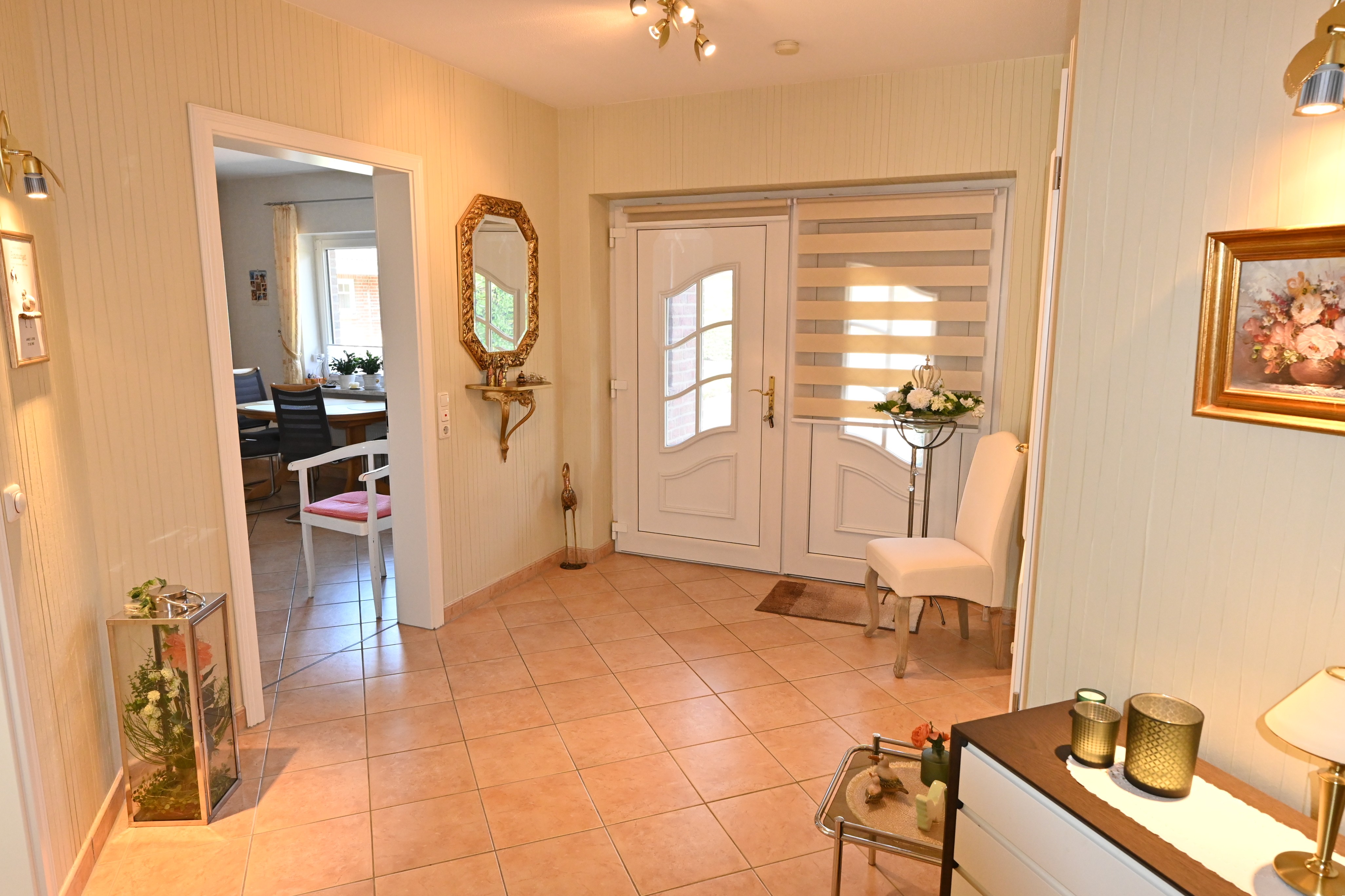 Nach Betreten des Hauses gelangt man über die große Diele in die Küche. Hier ist eine schöne Einbauküche verbaut, sowie Platz für ein Esstisch. Die Fenster über Spüle und Tisch sorgen für reichlich Tageslicht. Neben der Küche befindet sich der Hauswirtschaftsraum. Hier ist Platz für Waschmaschine und Trockner. Über den Hauswirtschaftsraum gelangt man in den Garten. Auf der gegenüberliegenden Seite der Küche befindet sich das Gäste-WC mit Dusche. Weiter über die Diele gelangt man ins große, helle Wohnzimmer mit Essbereich. Von hier gelangt man auf die große Terrasse der Südseite, aber auch auf die zweite Terrasse der Westseite. Weiter über Diele ist das Kinderzimmer zu erreichen. Gegenüber befindet sich das Bad mit einer Badewanne und einer Dusche. Zum Ende der Diele/Flur befindet sich rechts das Schlafzimmer. Das Schlafzimmer hat einen eigenen Zugang in den Garten. Neben dem Schlafzimmer befindet sich die Ankleide. Hier ist reichlich Platz für Schuhe, Hosen, usw.. Neben der Ankleide befindet sich das Gästezimmer. Durch die beiden Fenster gelangt reichlich Tageslicht in das Zimmer.