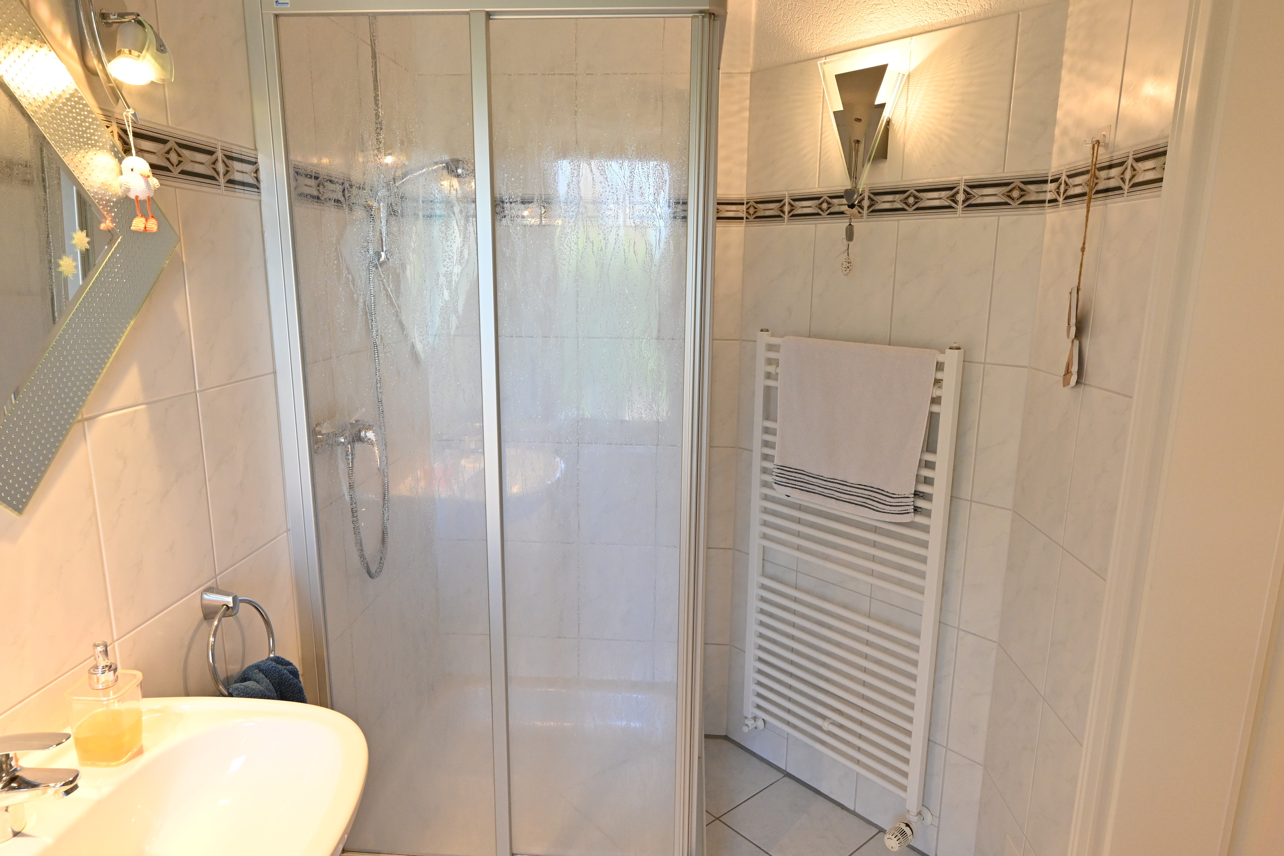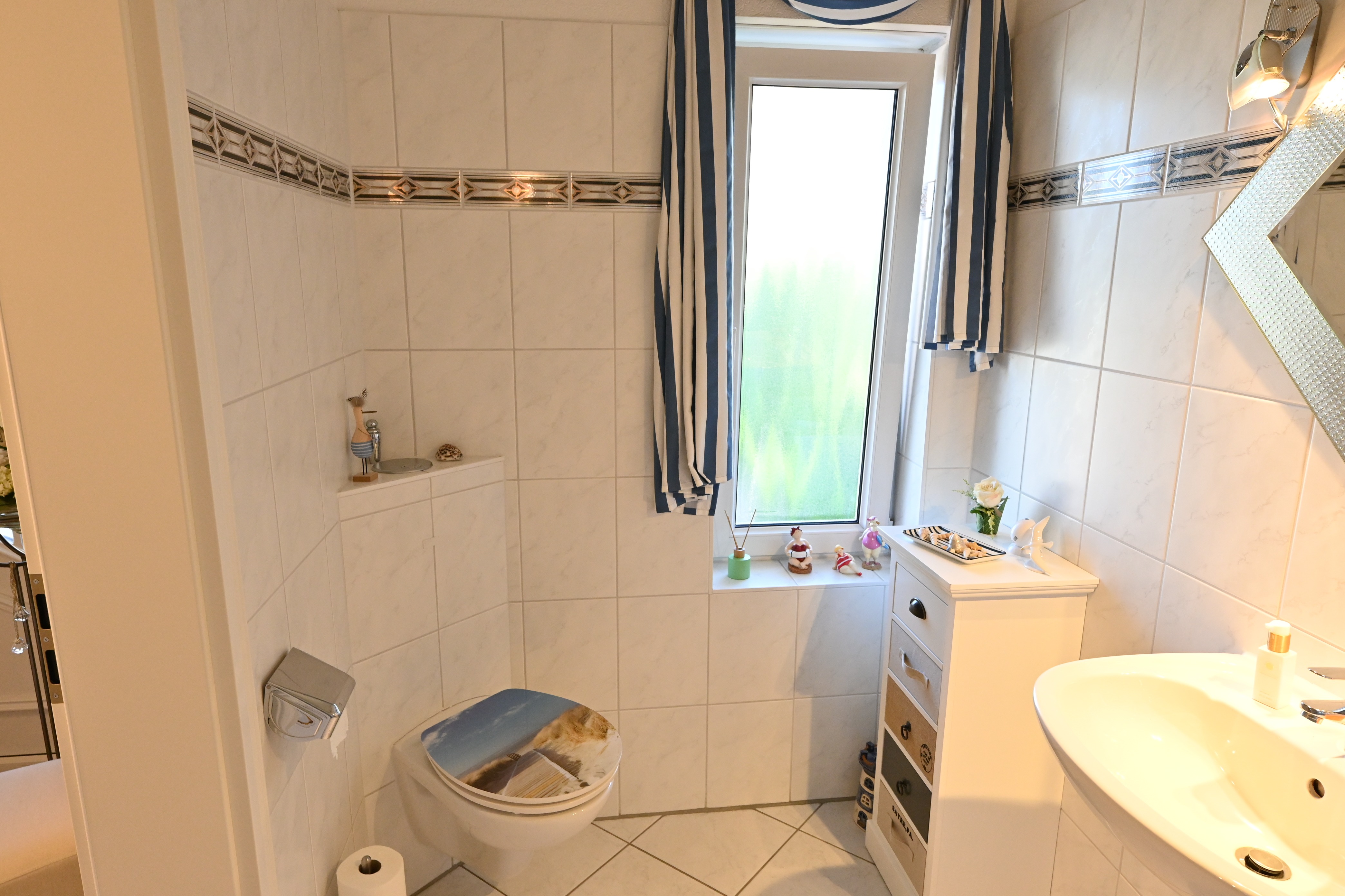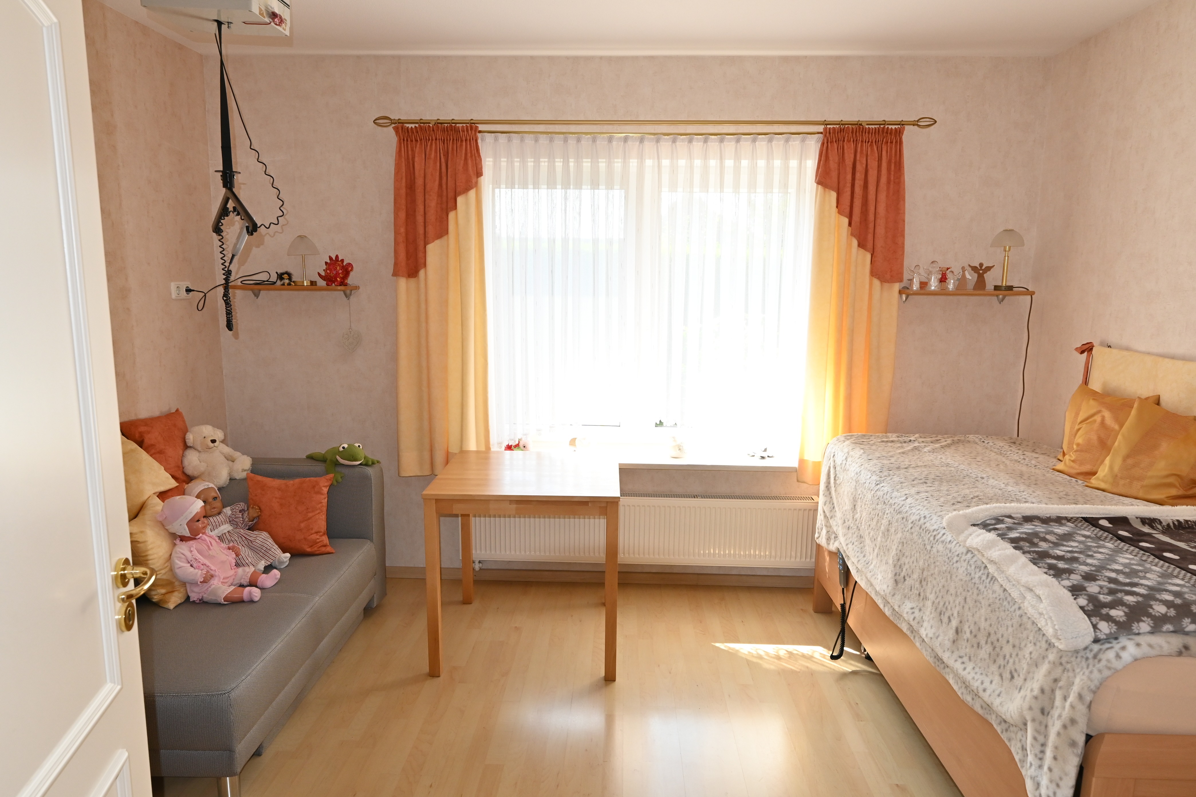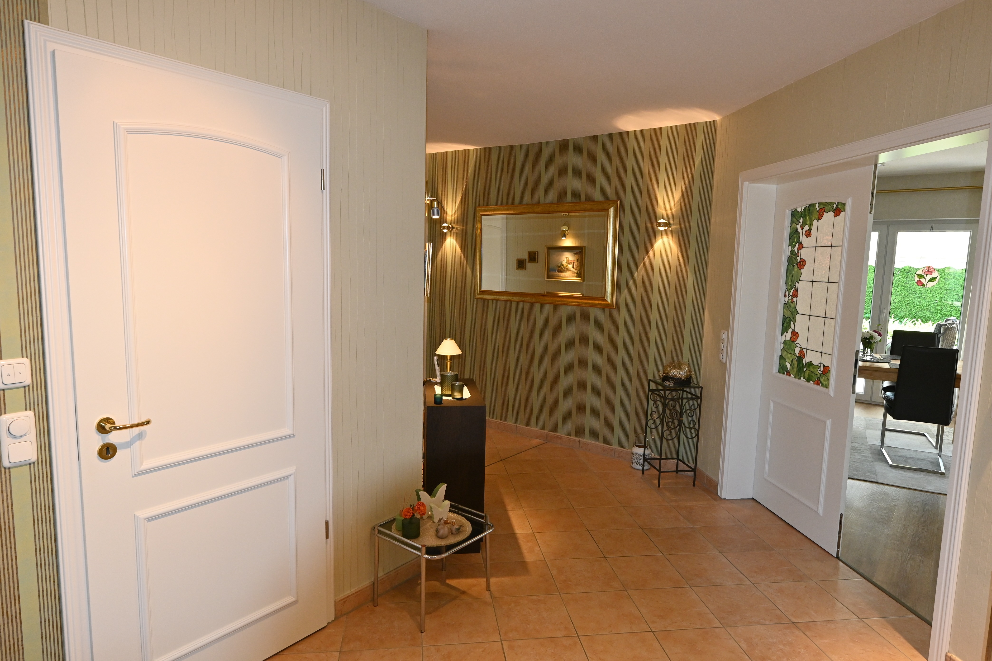 Nach Betreten des Hauses gelangt man über die große Diele in die Küche. Hier ist eine schöne Einbauküche verbaut, sowie Platz für ein Esstisch. Die Fenster über Spüle und Tisch sorgen für reichlich Tageslicht. Neben der Küche befindet sich der Hauswirtschaftsraum. Hier ist Platz für Waschmaschine und Trockner. Über den Hauswirtschaftsraum gelangt man in den Garten. Auf der gegenüberliegenden Seite der Küche befindet sich das Gäste-WC mit Dusche. Weiter über die Diele gelangt man ins große, helle Wohnzimmer mit Essbereich. Von hier gelangt man auf die große Terrasse der Südseite, aber auch auf die zweite Terrasse der Westseite. Weiter über Diele ist das Kinderzimmer zu erreichen. Gegenüber befindet sich das Bad mit einer Badewanne und einer Dusche. Zum Ende der Diele/Flur befindet sich rechts das Schlafzimmer. Das Schlafzimmer hat einen eigenen Zugang in den Garten. Neben dem Schlafzimmer befindet sich die Ankleide. Hier ist reichlich Platz für Schuhe, Hosen, usw.. Neben der Ankleide befindet sich das Gästezimmer. Durch die beiden Fenster gelangt reichlich Tageslicht in das Zimmer.