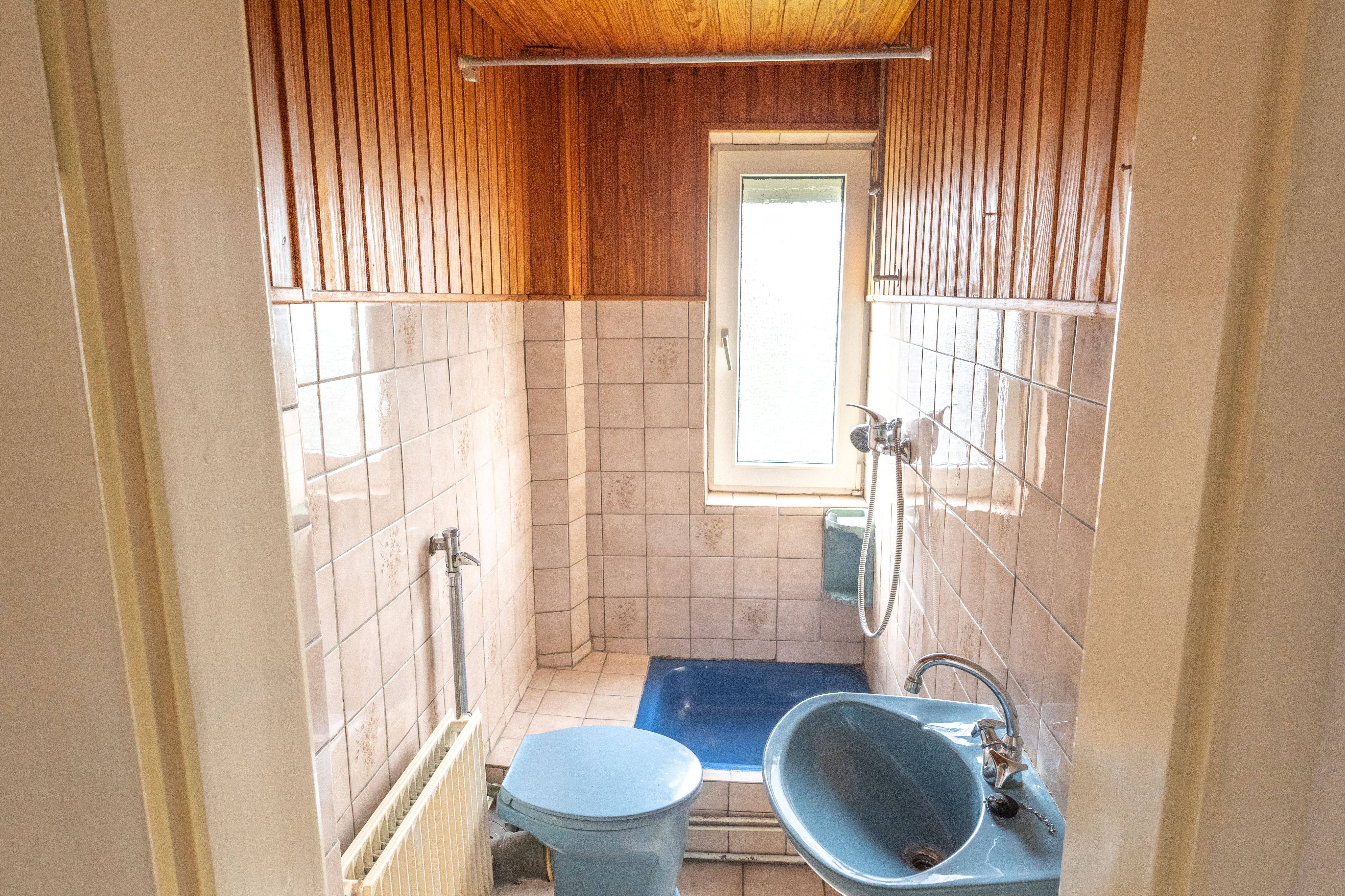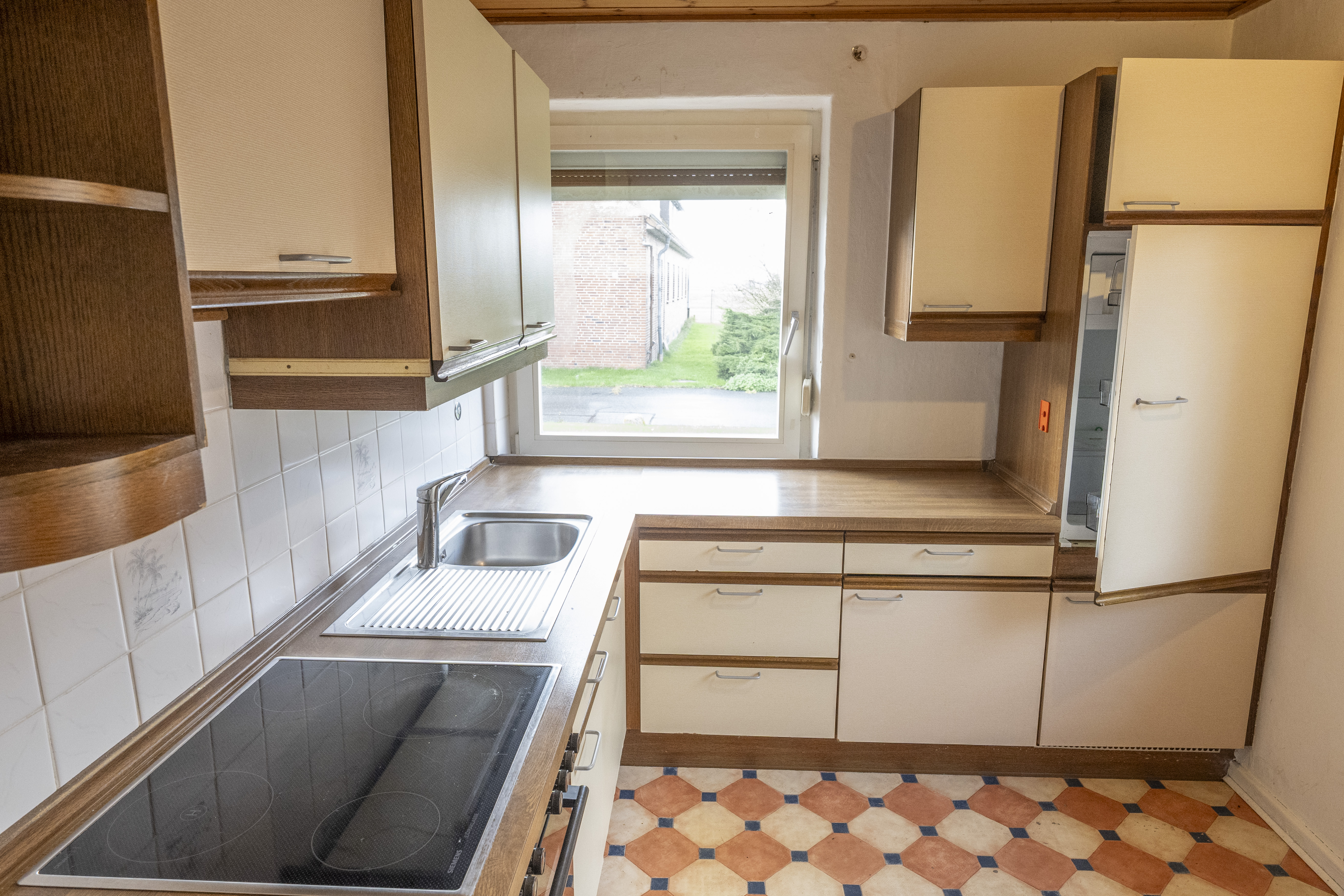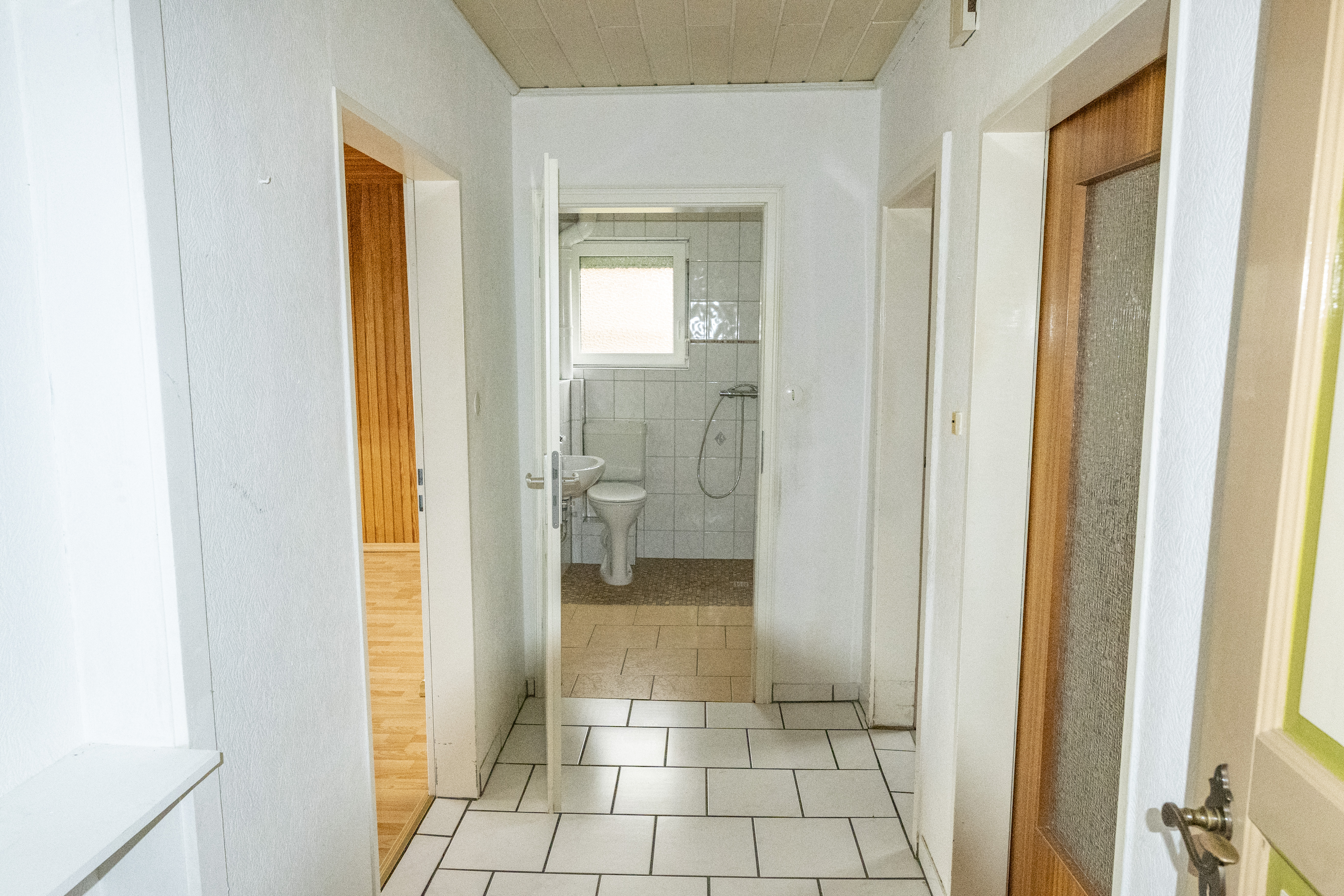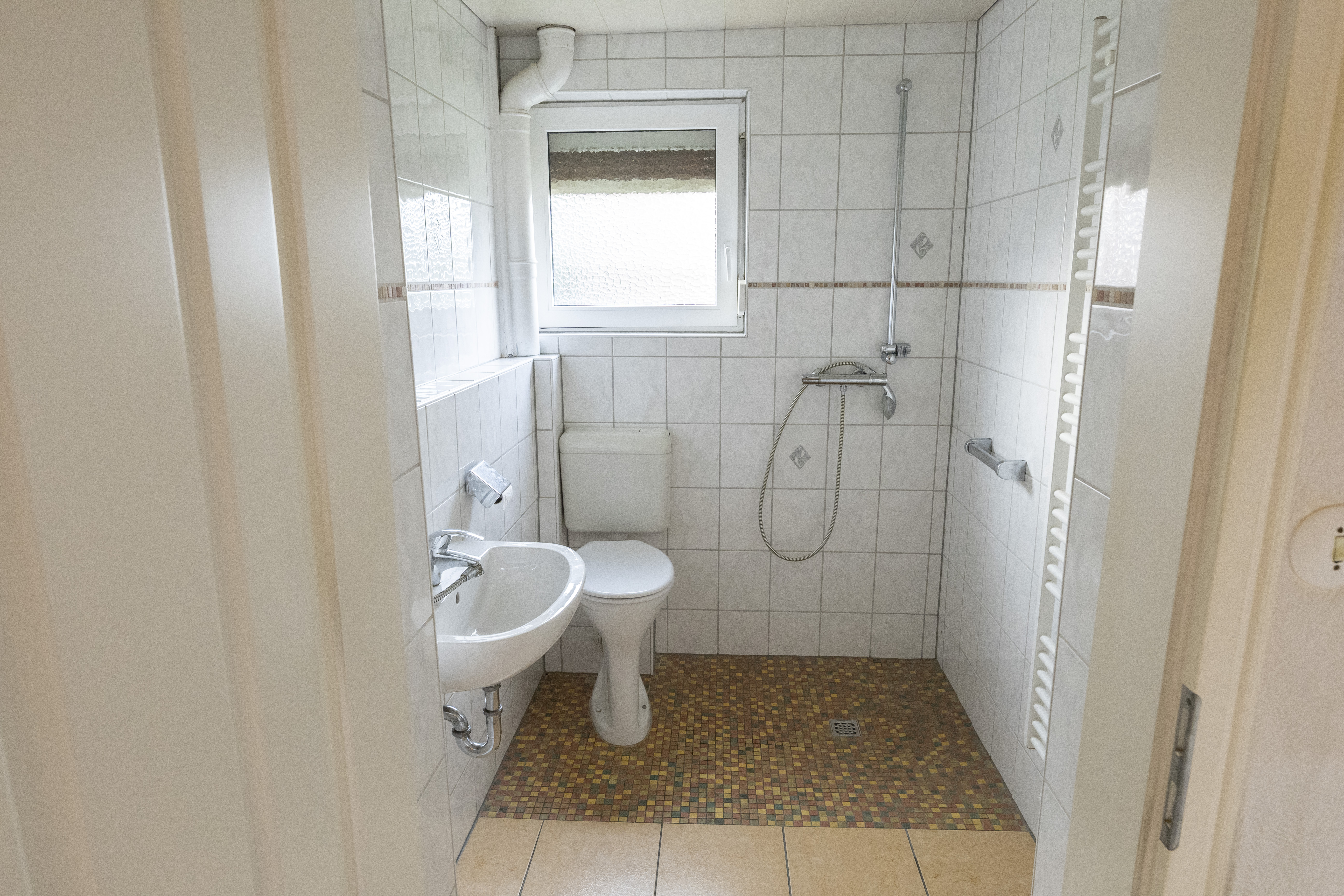 Im Erdgeschoss befinden sich 1,5 Zimmer (Wohn-Esszimmer, Kinderzimmer) Küche, Bad und Flur. Aus dem Wohnzimmer gelangt man über eine Tür in den Garten. Das Bad hat eine ebenerdige Dusche und wurde vor einigen Jahren saniert.